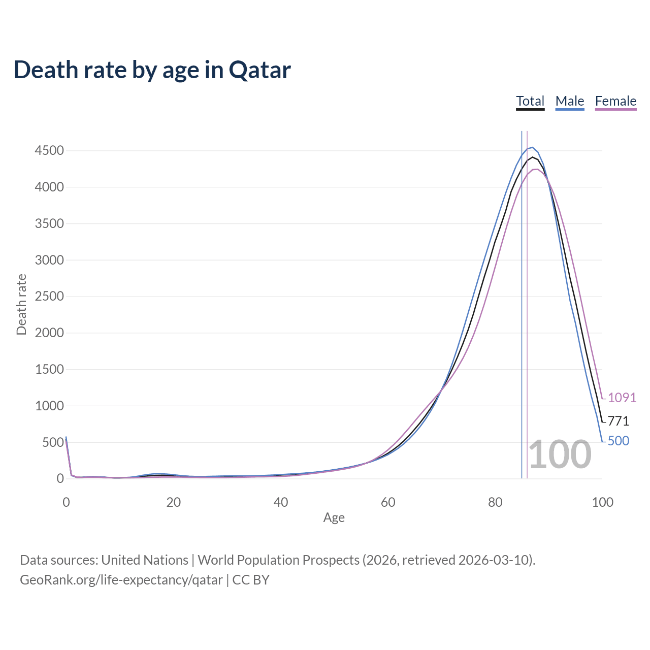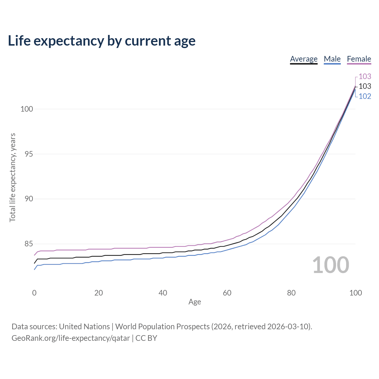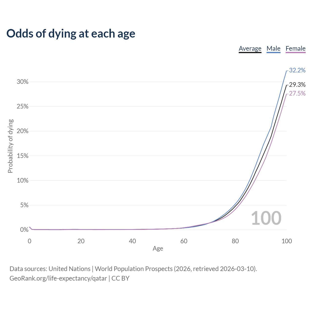 This life expectancy calculator shows the odds of living to 100, 95, 90, and below based on current age for both males and females in Qatar, along with mean and median age of death. The calculations are based on the 2026 life tables (actuarial tables) from the UN World Population Prospects.
