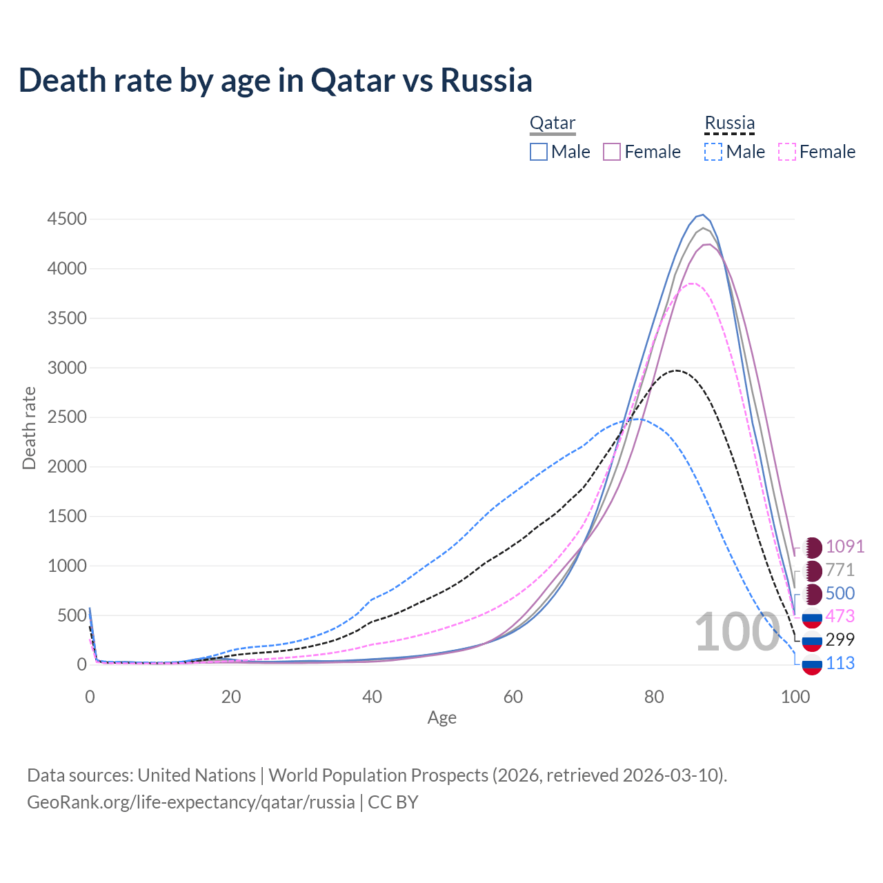 In Qatar, the most common age of death is 87, compared to 83 in Russia. The median age of death is 85.1 in Qatar and 77.5 in Russia, meaning only half of each cohort is expected to live past that age.