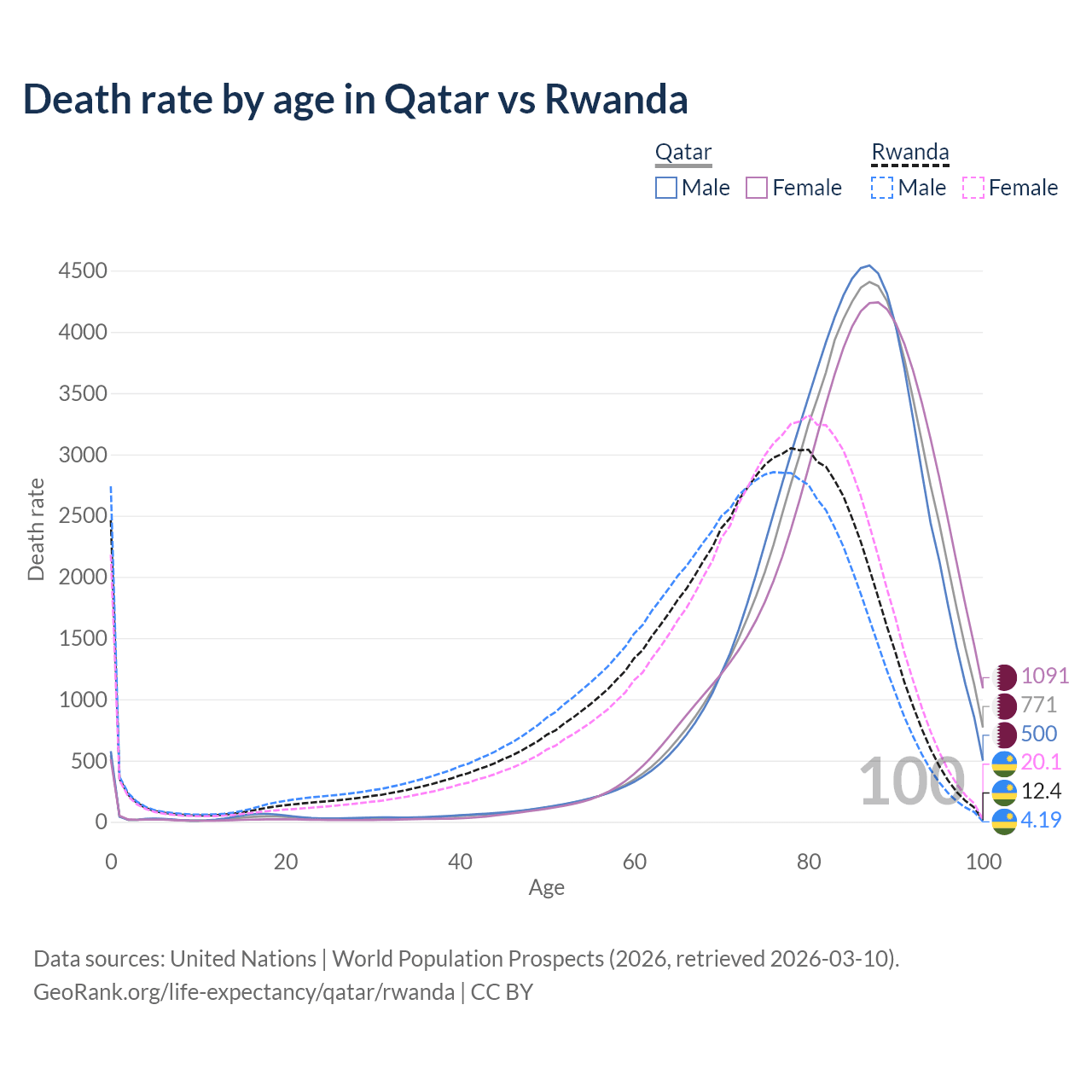 In Qatar, the most common age of death is 87, compared to 78 in Rwanda. The median age of death is 85.1 in Qatar and 73.5 in Rwanda, meaning only half of each cohort is expected to live past that age.