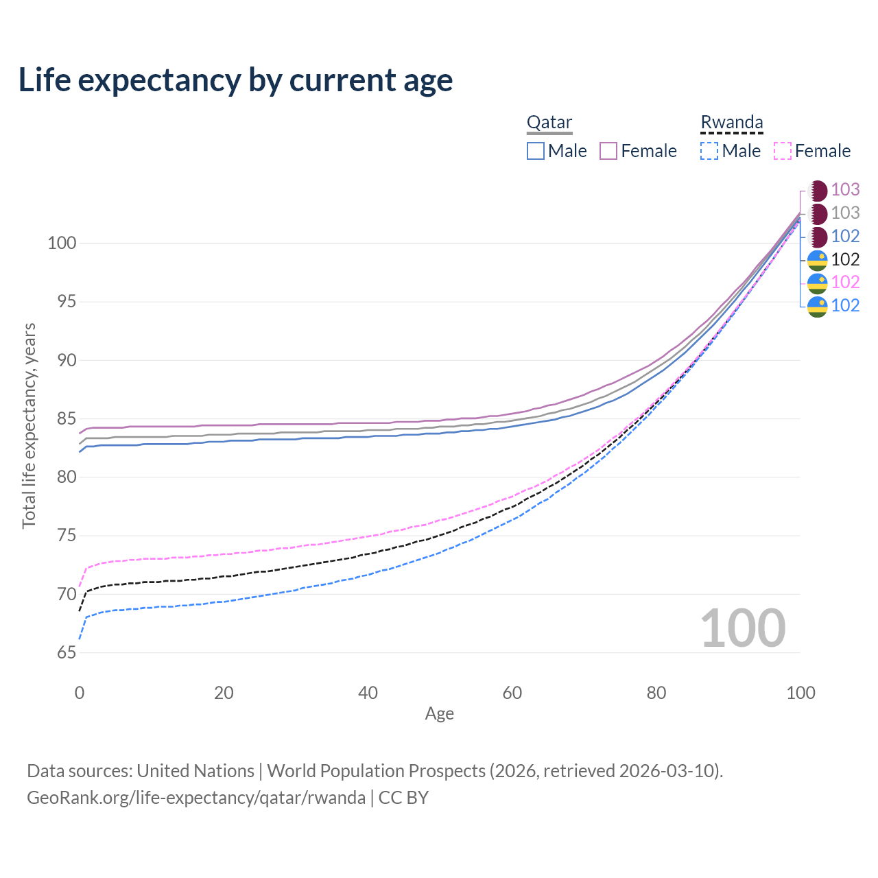 This life expectancy calculator shows the odds of living to 100, 95, 90, and below based on current age for both males and females in Qatar and Rwanda, along with mean and median age of death. The calculations are based on the 2026 life tables (actuarial tables) from the UN World Population Prospects.