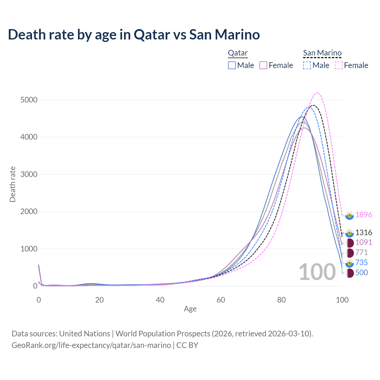 In Qatar, the most common age of death is 87, compared to 91 in San Marino. The median age of death is 85.1 in Qatar and 88.3 in San Marino, meaning only half of each cohort is expected to live past that age.