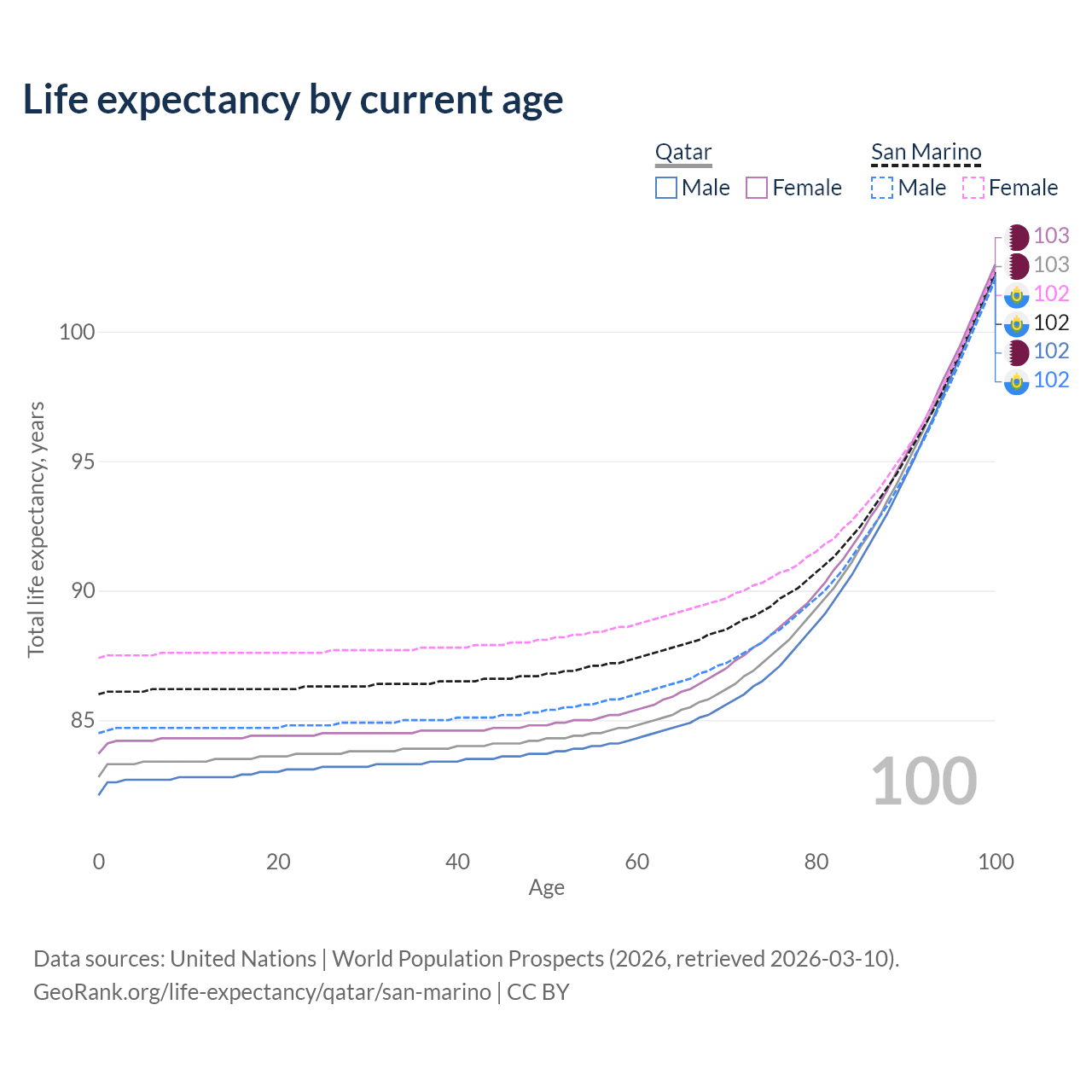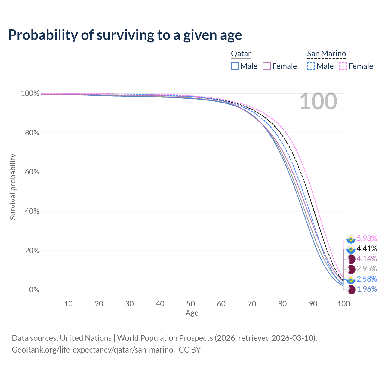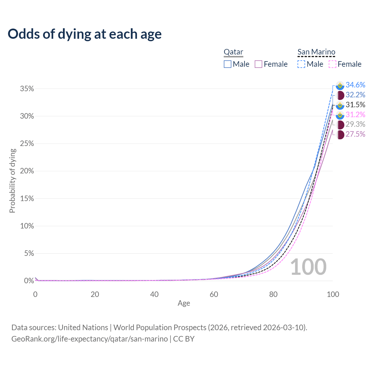 This life expectancy calculator shows the odds of living to 100, 95, 90, and below based on current age for both males and females in Qatar and San Marino, along with mean and median age of death. The calculations are based on the 2026 life tables (actuarial tables) from the UN World Population Prospects.