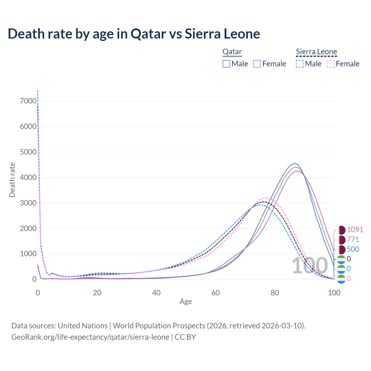 In Qatar, the most common age of death is 87, compared to 0 in Sierra Leone. The median age of death is 85.1 in Qatar and 70.8 in Sierra Leone, meaning only half of each cohort is expected to live past that age.