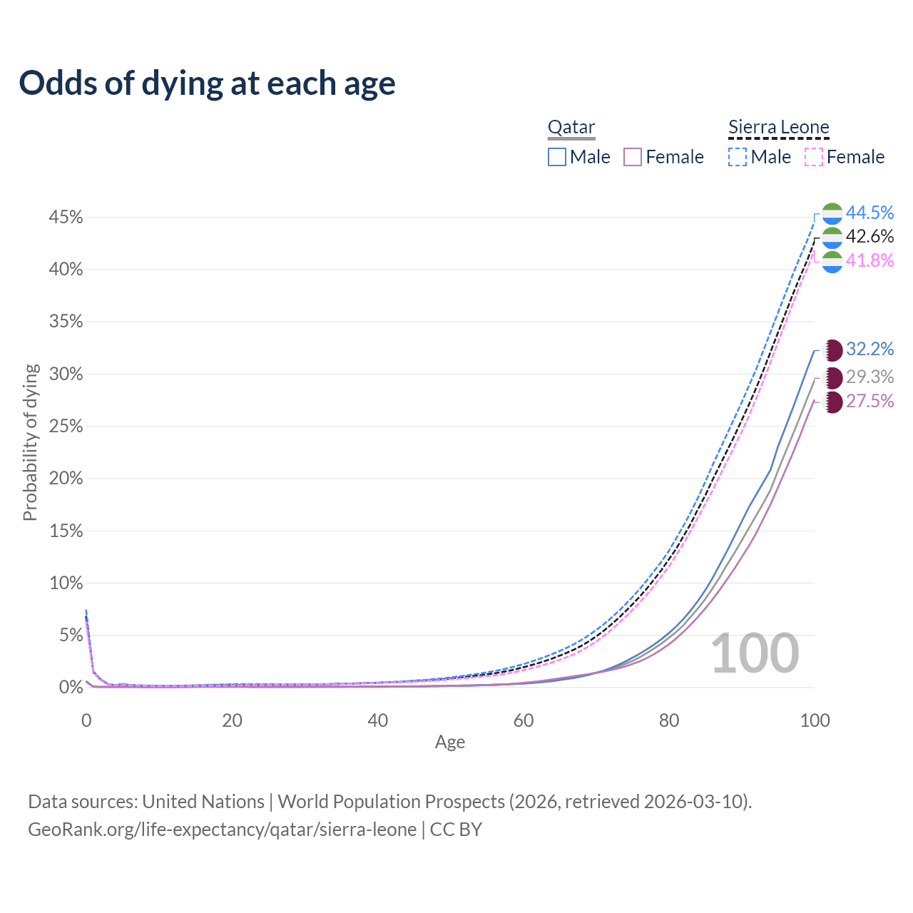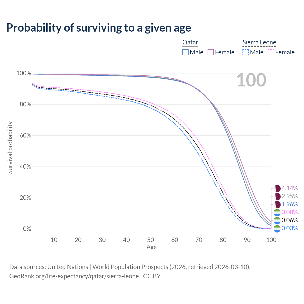 This life expectancy calculator shows the odds of living to 100, 95, 90, and below based on current age for both males and females in Qatar and Sierra Leone, along with mean and median age of death. The calculations are based on the 2026 life tables (actuarial tables) from the UN World Population Prospects.
