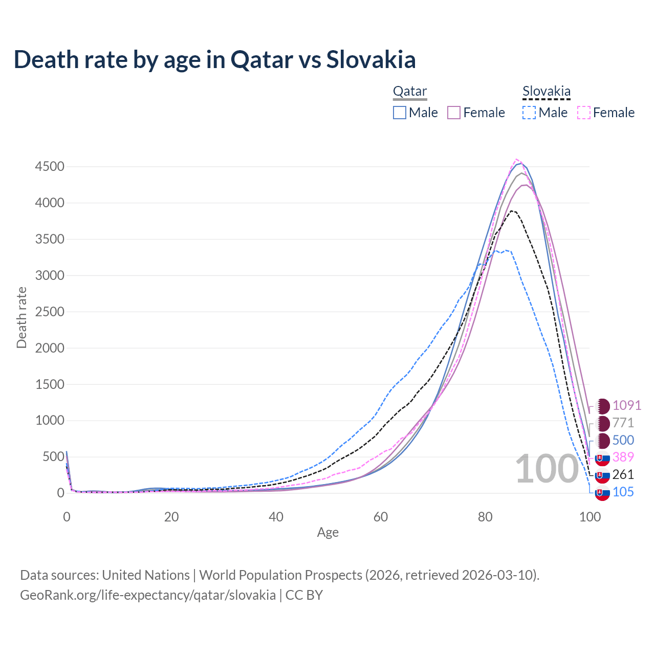 This life expectancy calculator shows the odds of living to 100, 95, 90, and below based on current age for both males and females in Qatar and Slovakia, along with mean and median age of death. The calculations are based on the 2026 life tables (actuarial tables) from the UN World Population Prospects.