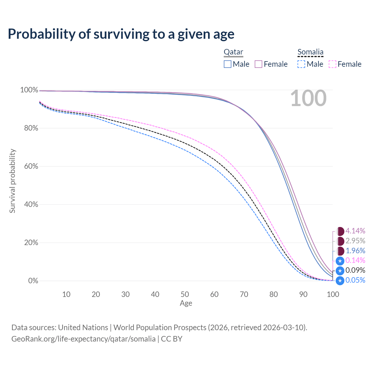 This life expectancy calculator shows the odds of living to 100, 95, 90, and below based on current age for both males and females in Qatar and Somalia, along with mean and median age of death. The calculations are based on the 2026 life tables (actuarial tables) from the UN World Population Prospects.