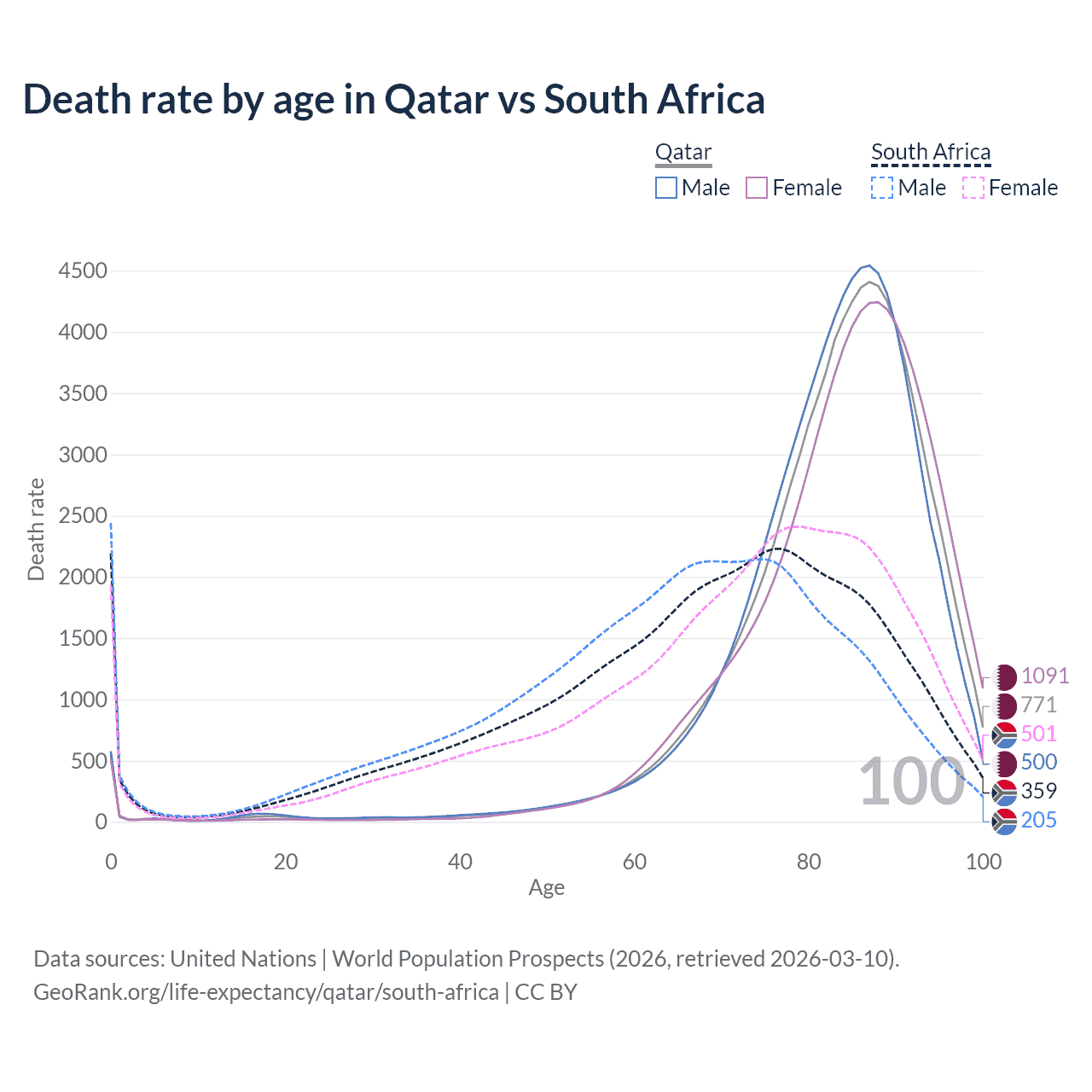 In Qatar, the most common age of death is 87, compared to 77 in South Africa. The median age of death is 85.1 in Qatar and 70.8 in South Africa, meaning only half of each cohort is expected to live past that age.