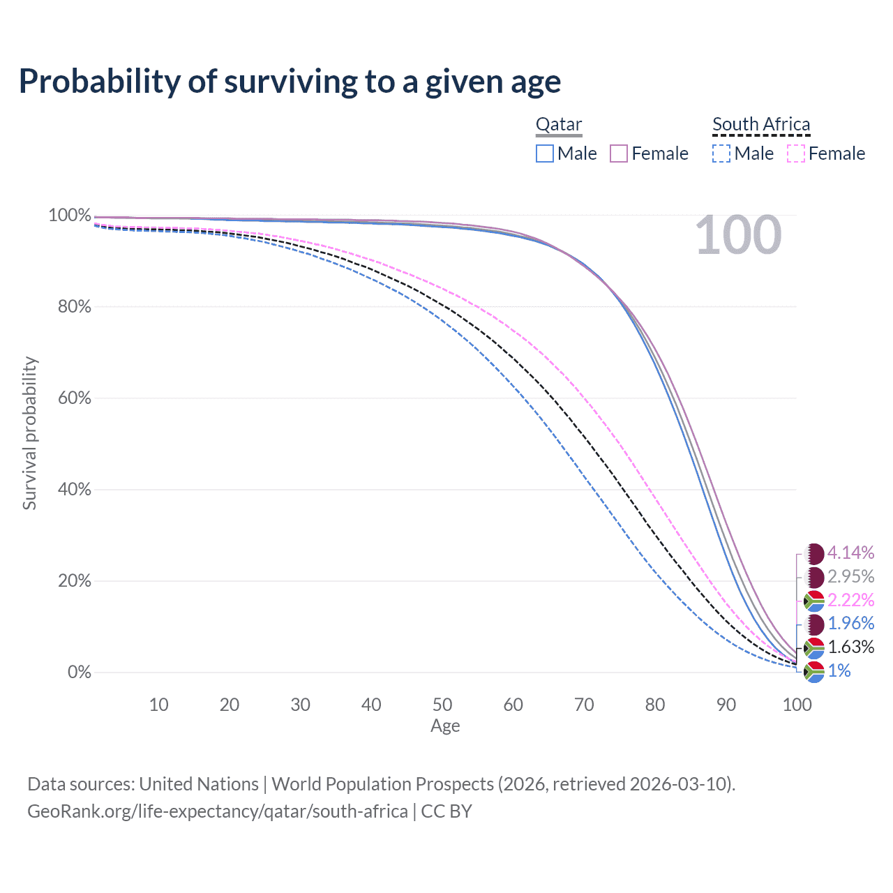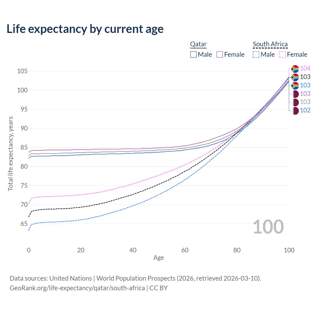 This life expectancy calculator shows the odds of living to 100, 95, 90, and below based on current age for both males and females in Qatar and South Africa, along with mean and median age of death. The calculations are based on the 2026 life tables (actuarial tables) from the UN World Population Prospects.