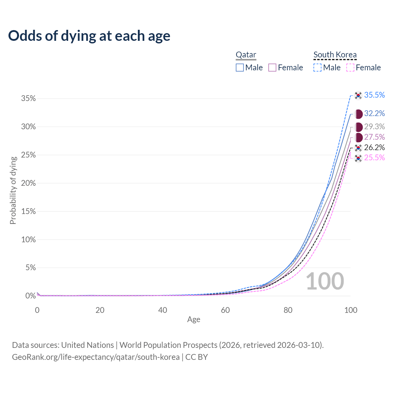 This life expectancy calculator shows the odds of living to 100, 95, 90, and below based on current age for both males and females in Qatar and South Korea, along with mean and median age of death. The calculations are based on the 2026 life tables (actuarial tables) from the UN World Population Prospects.