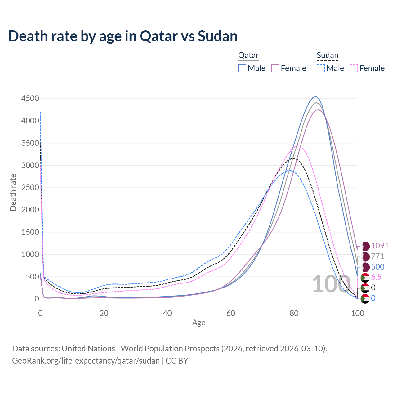 In Qatar, the most common age of death is 87, compared to 0 in Sudan. The median age of death is 85.1 in Qatar and 74.1 in Sudan, meaning only half of each cohort is expected to live past that age.