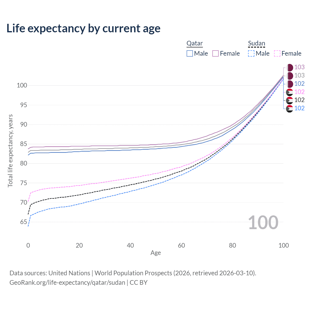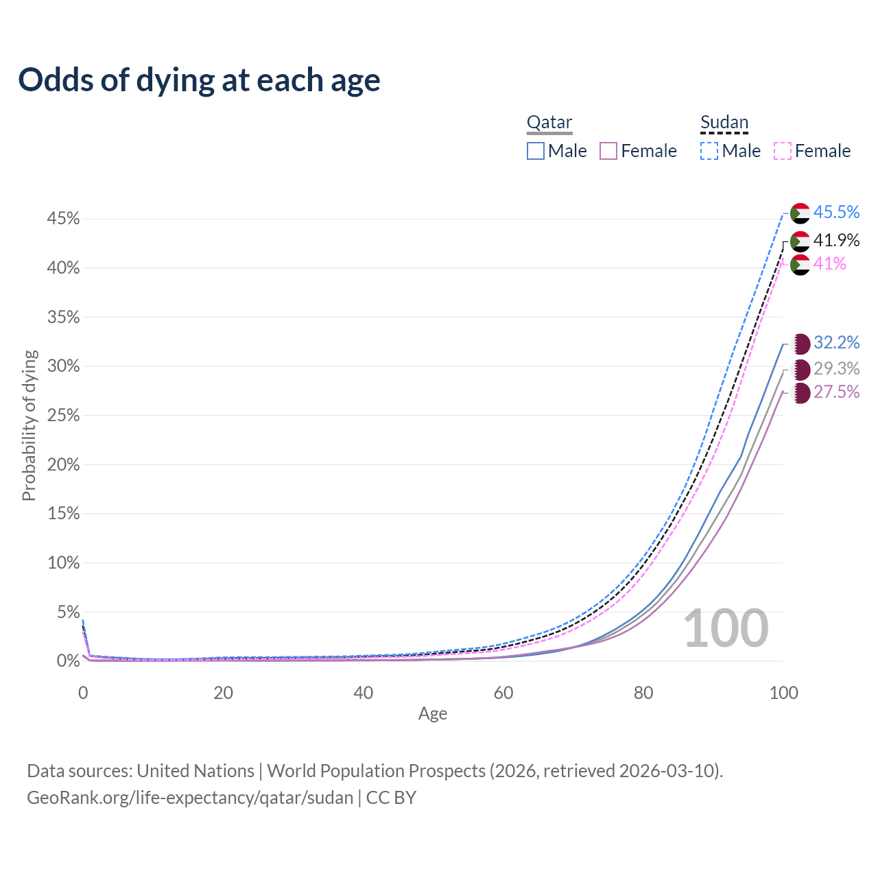 This life expectancy calculator shows the odds of living to 100, 95, 90, and below based on current age for both males and females in Qatar and Sudan, along with mean and median age of death. The calculations are based on the 2026 life tables (actuarial tables) from the UN World Population Prospects.