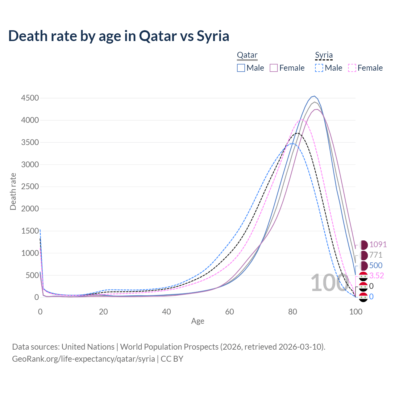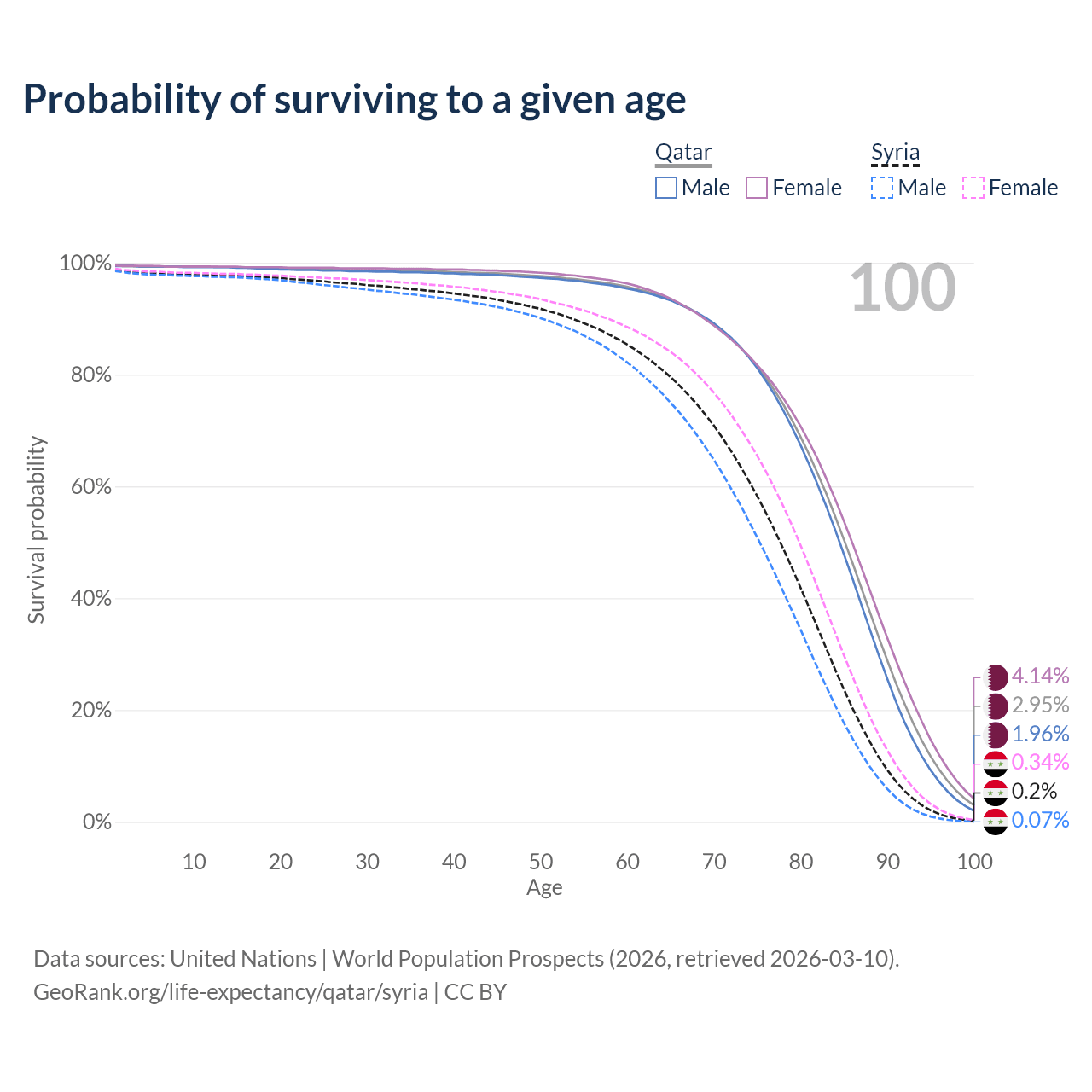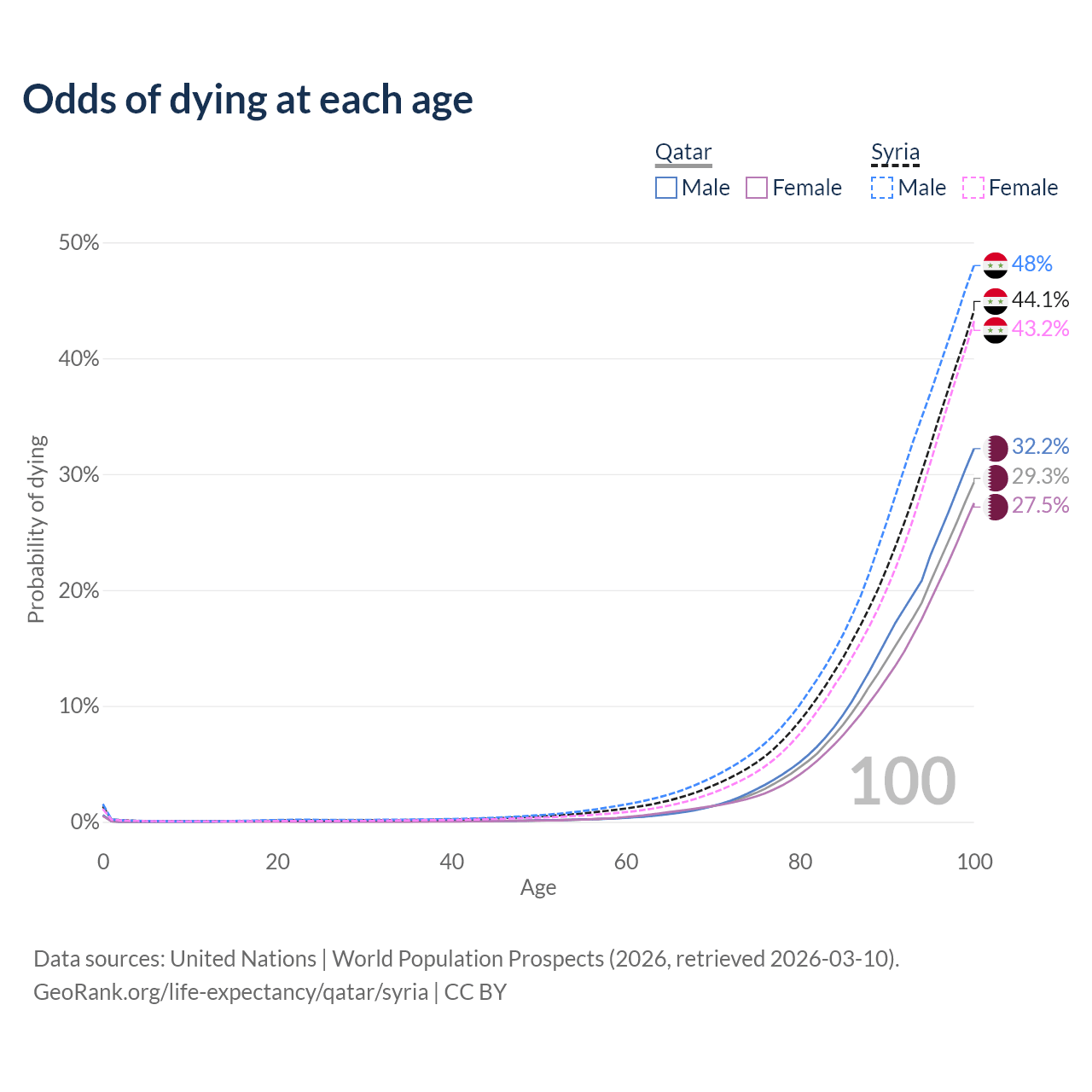 This life expectancy calculator shows the odds of living to 100, 95, 90, and below based on current age for both males and females in Qatar and Syria, along with mean and median age of death. The calculations are based on the 2026 life tables (actuarial tables) from the UN World Population Prospects.
