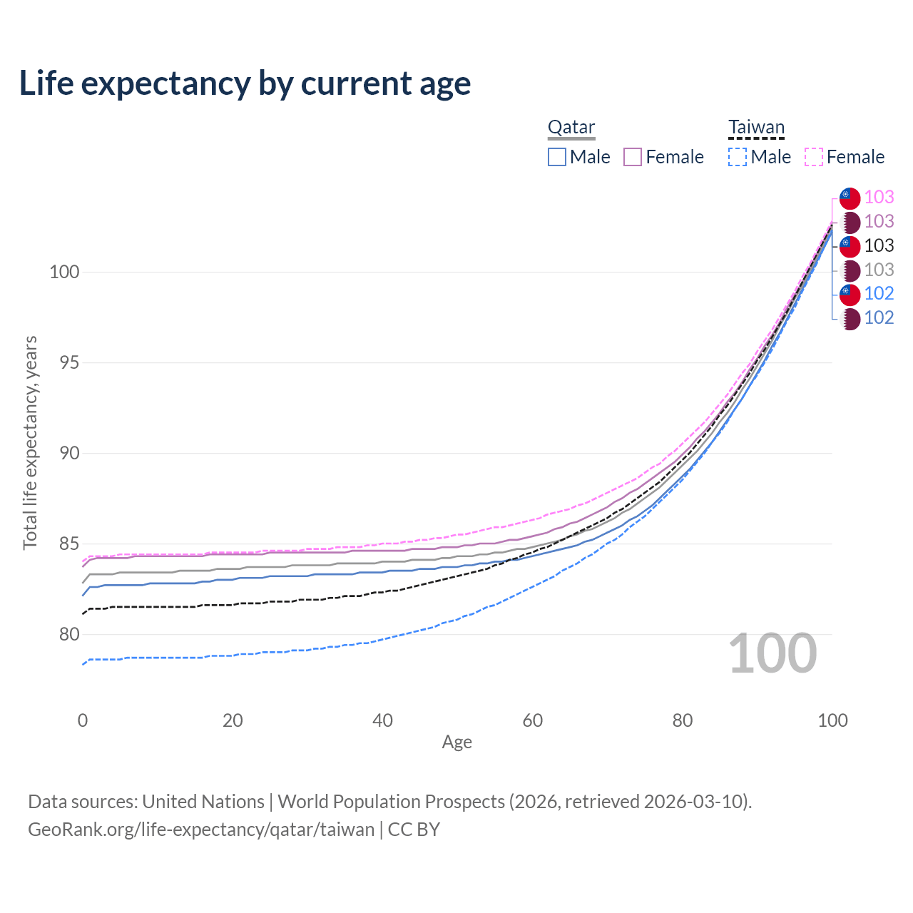 This life expectancy calculator shows the odds of living to 100, 95, 90, and below based on current age for both males and females in Qatar and Taiwan, along with mean and median age of death. The calculations are based on the 2026 life tables (actuarial tables) from the UN World Population Prospects.