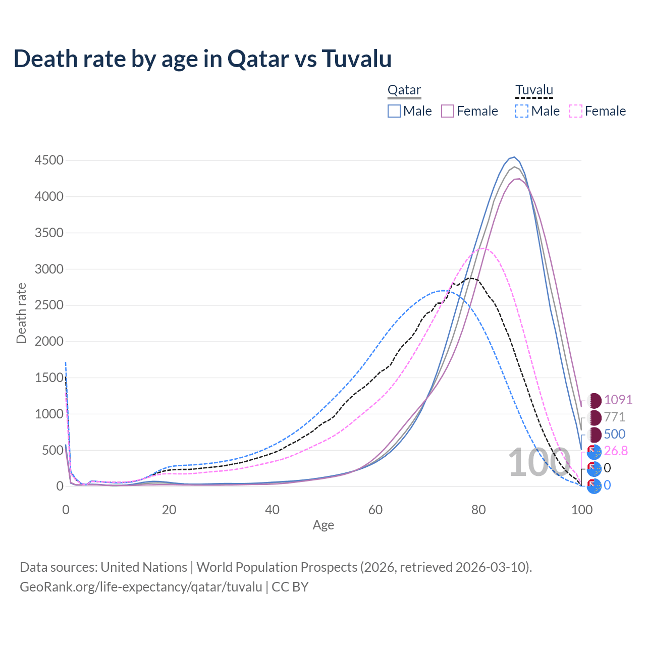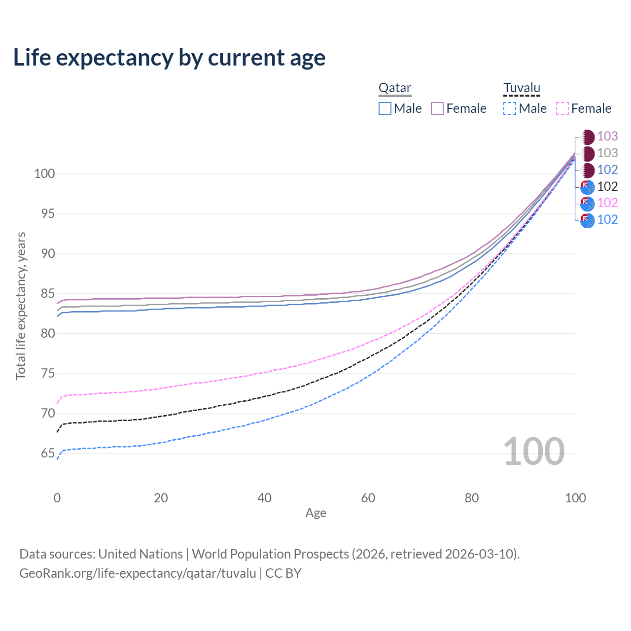 This life expectancy calculator shows the odds of living to 100, 95, 90, and below based on current age for both males and females in Qatar and Tuvalu, along with mean and median age of death. The calculations are based on the 2026 life tables (actuarial tables) from the UN World Population Prospects.