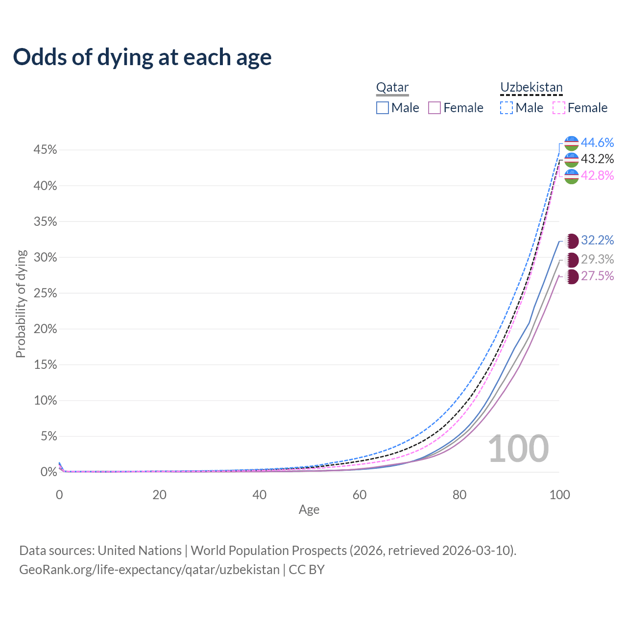 This life expectancy calculator shows the odds of living to 100, 95, 90, and below based on current age for both males and females in Qatar and Uzbekistan, along with mean and median age of death. The calculations are based on the 2026 life tables (actuarial tables) from the UN World Population Prospects.