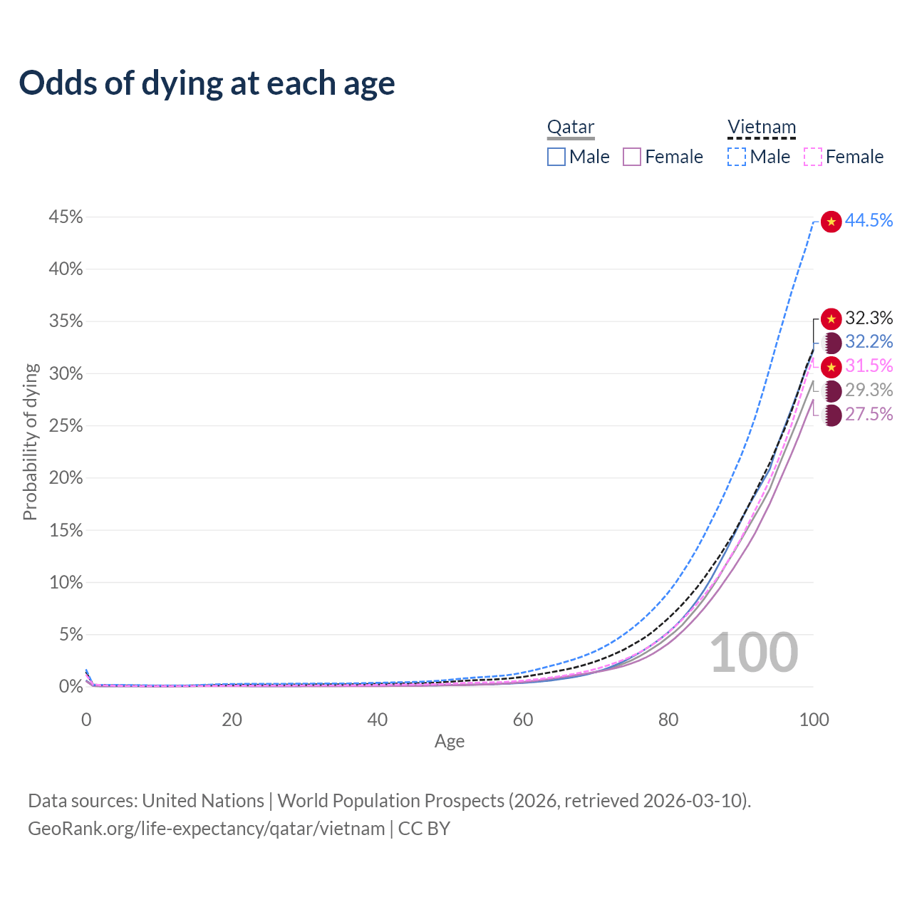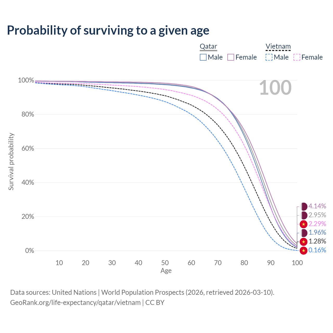 This life expectancy calculator shows the odds of living to 100, 95, 90, and below based on current age for both males and females in Qatar and Vietnam, along with mean and median age of death. The calculations are based on the 2026 life tables (actuarial tables) from the UN World Population Prospects.