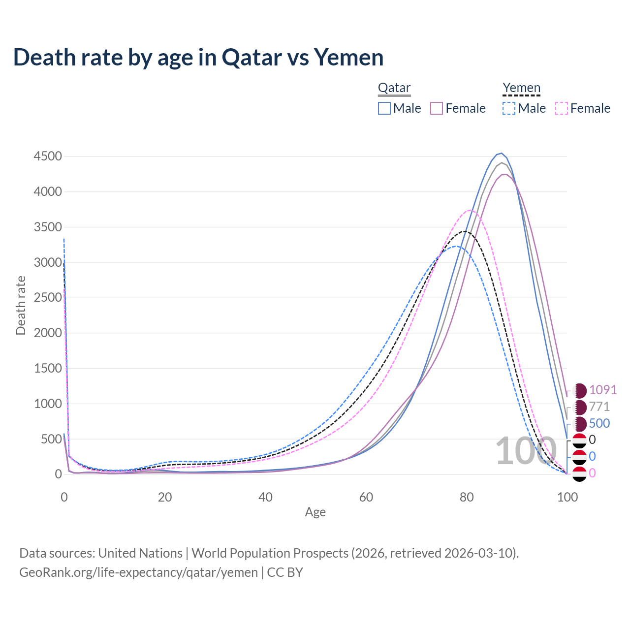 In Qatar, the most common age of death is 87, compared to 80 in Yemen. The median age of death is 85.1 in Qatar and 74.9 in Yemen, meaning only half of each cohort is expected to live past that age.