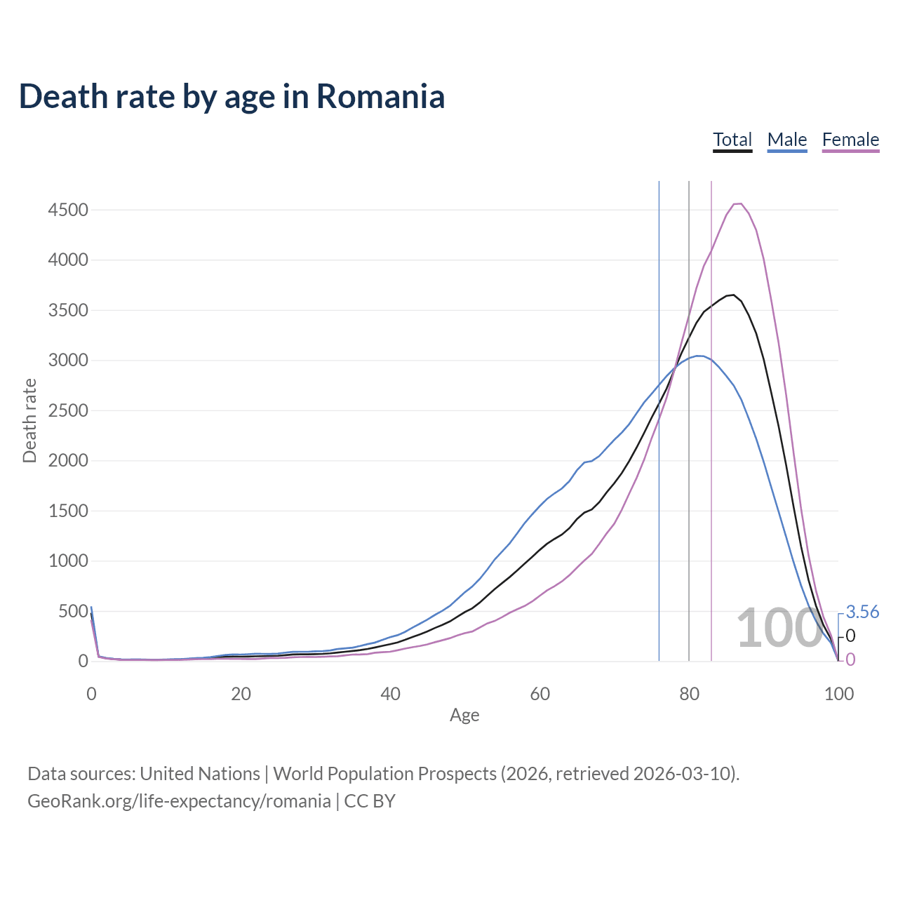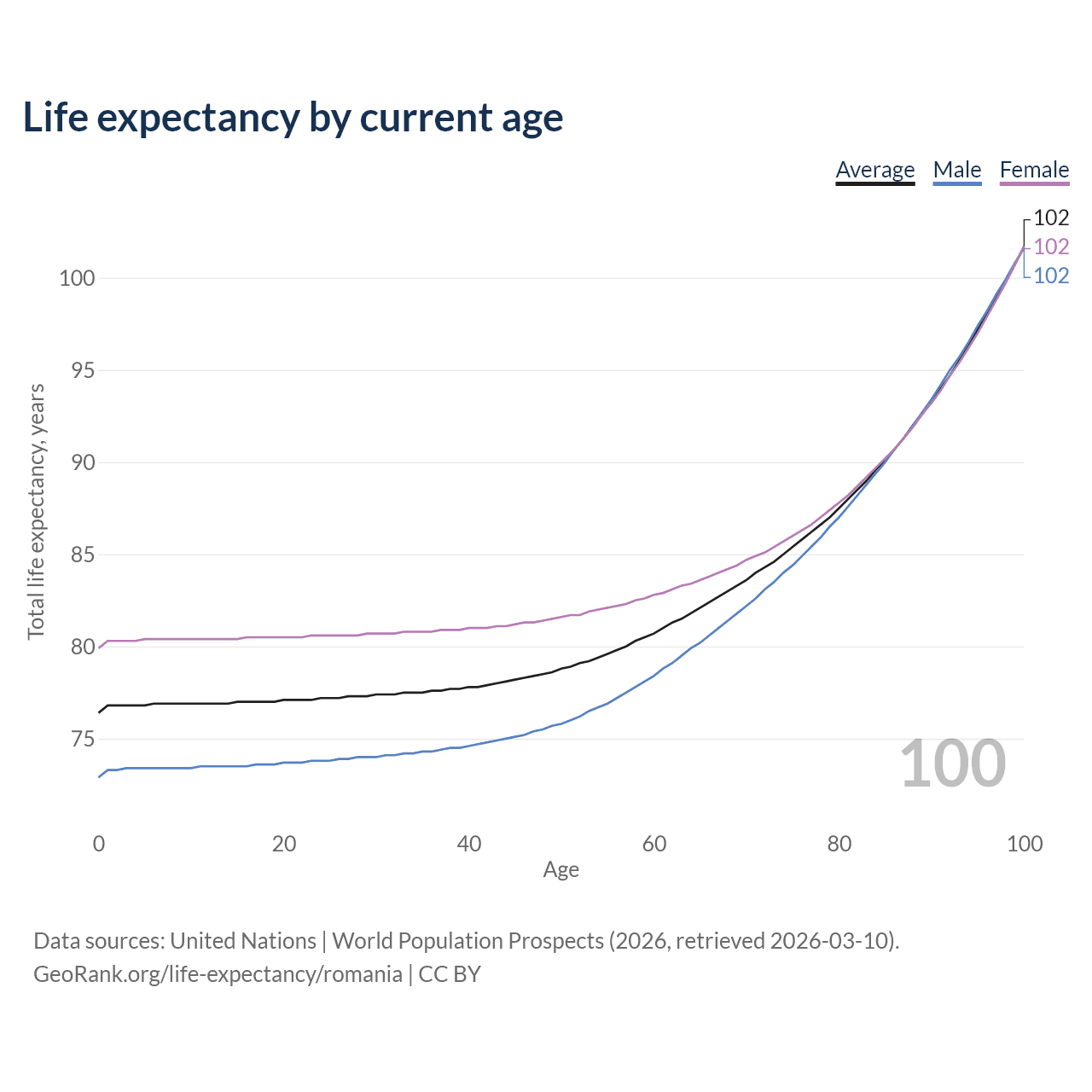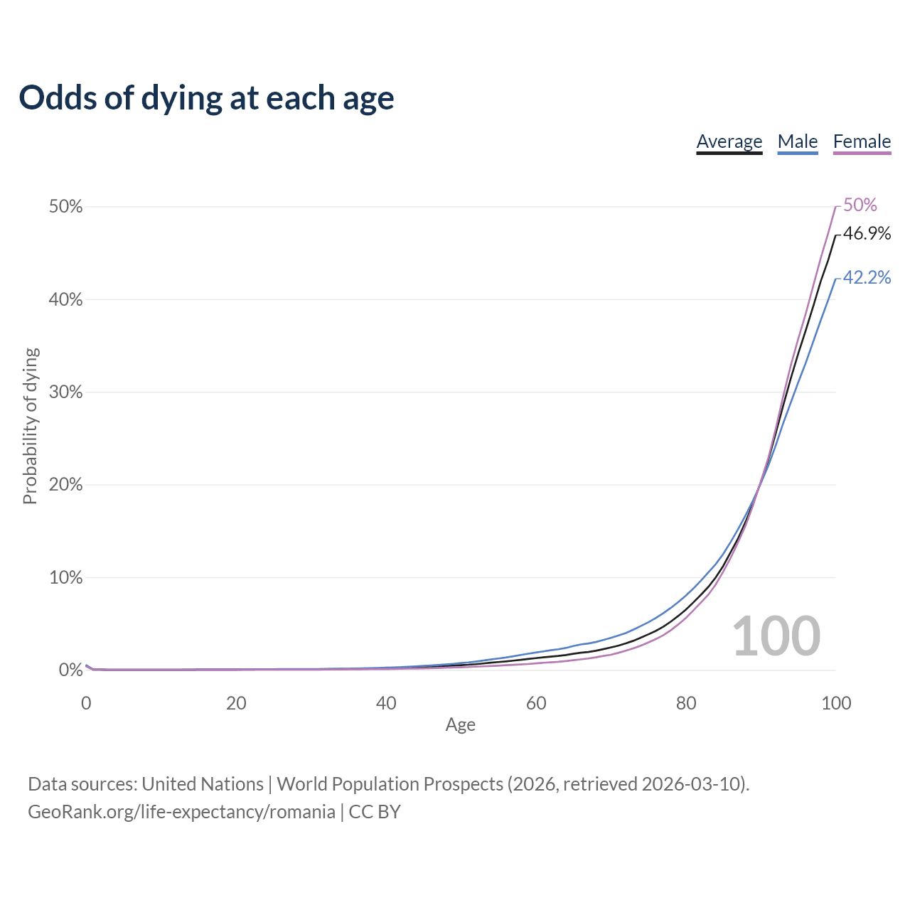This life expectancy calculator shows the odds of living to 100, 95, 90, and below based on current age for both males and females in Romania, along with mean and median age of death. The calculations are based on the 2026 life tables (actuarial tables) from the UN World Population Prospects.