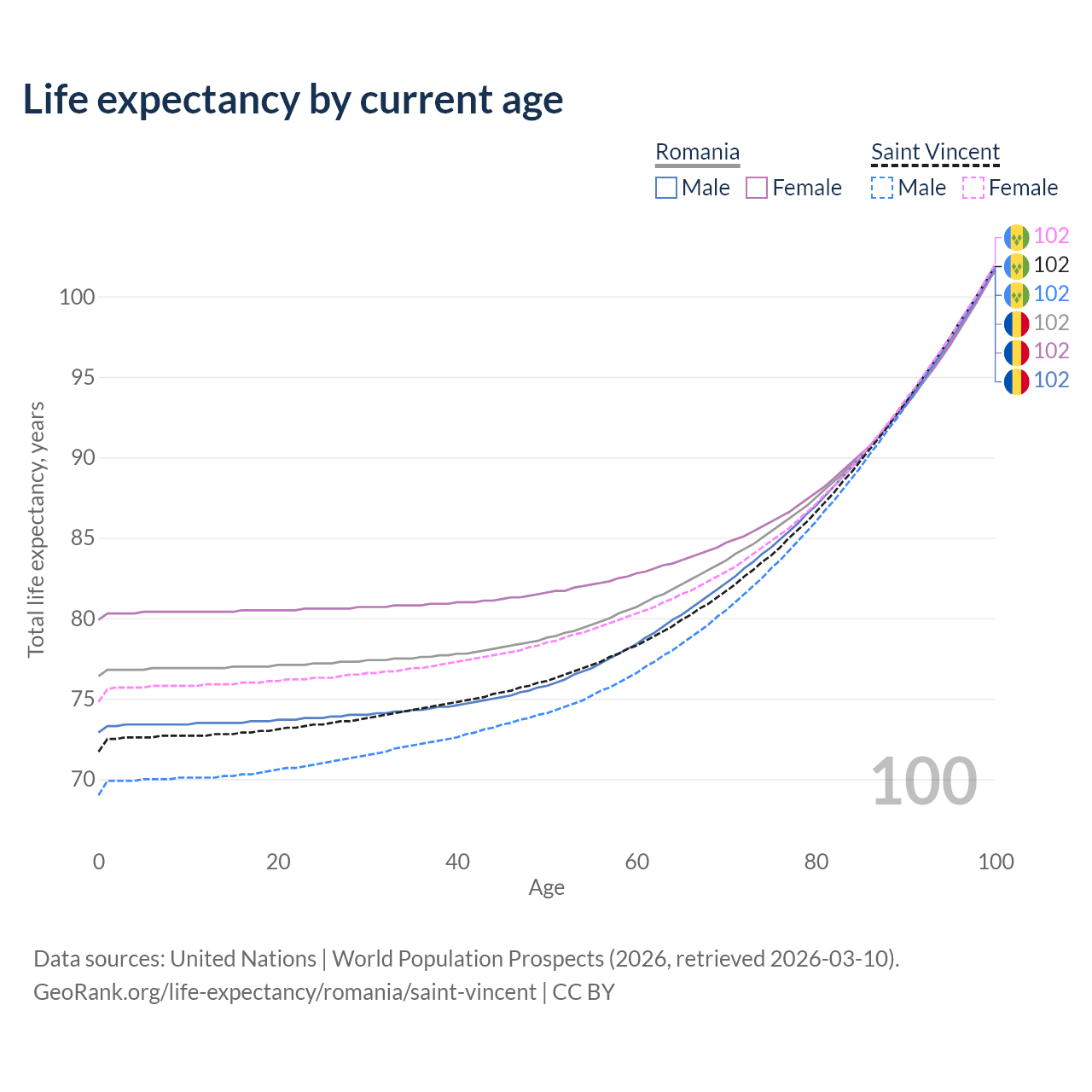 This life expectancy calculator shows the odds of living to 100, 95, 90, and below based on current age for both males and females in Romania and Saint Vincent, along with mean and median age of death. The calculations are based on the 2026 life tables (actuarial tables) from the UN World Population Prospects.