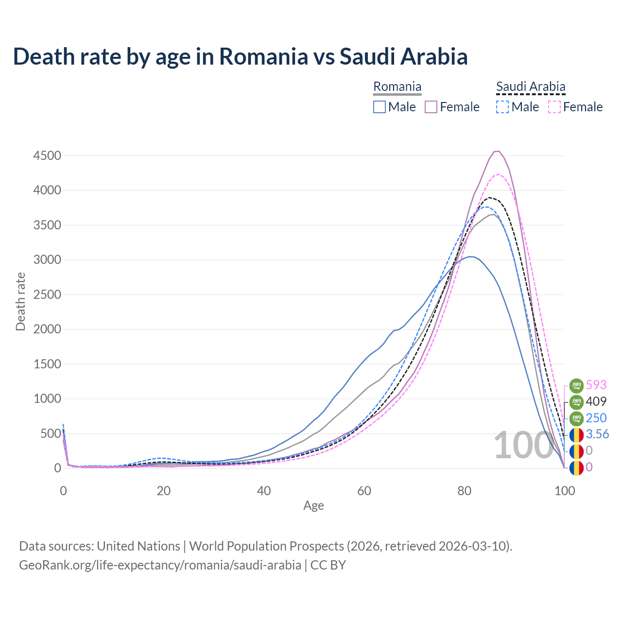 This life expectancy calculator shows the odds of living to 100, 95, 90, and below based on current age for both males and females in Romania and Saudi Arabia, along with mean and median age of death. The calculations are based on the 2026 life tables (actuarial tables) from the UN World Population Prospects.