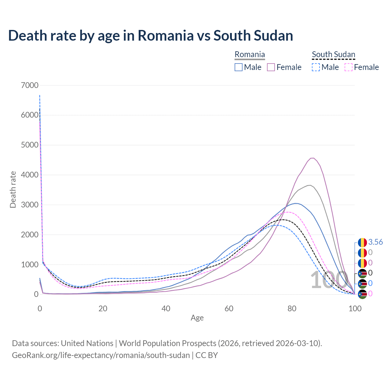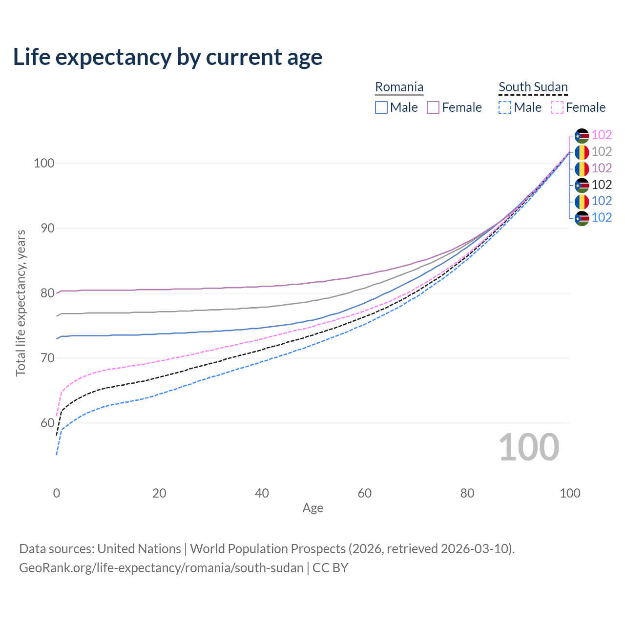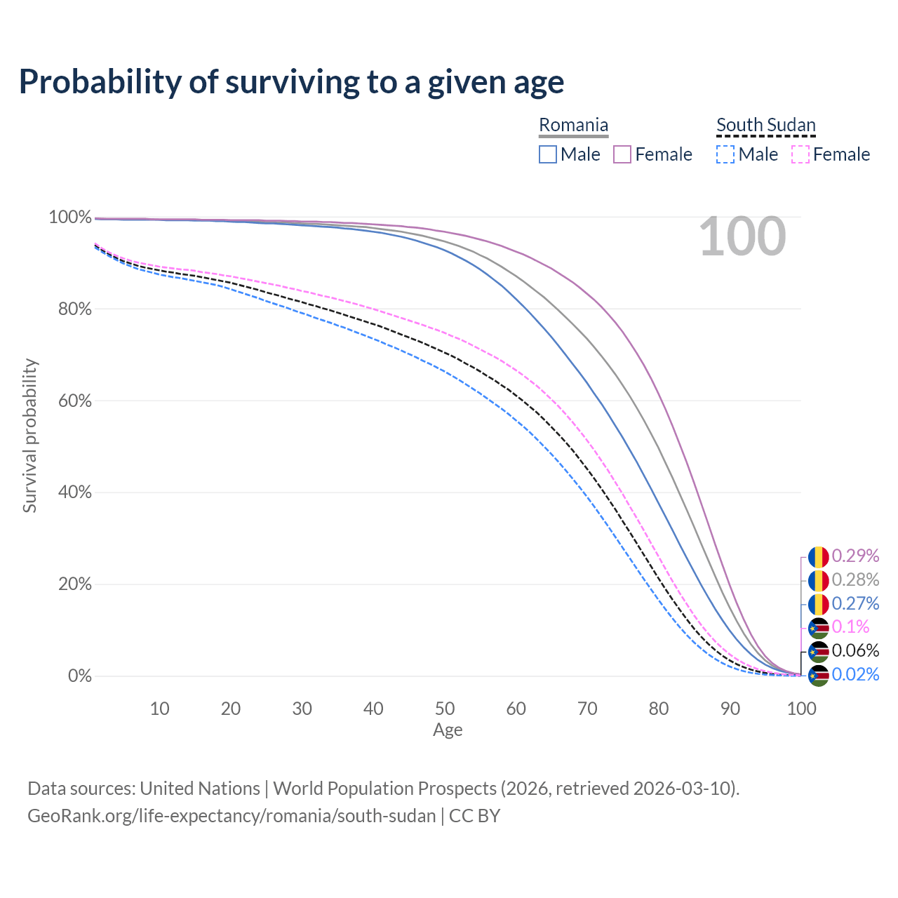 This life expectancy calculator shows the odds of living to 100, 95, 90, and below based on current age for both males and females in Romania and South Sudan, along with mean and median age of death. The calculations are based on the 2026 life tables (actuarial tables) from the UN World Population Prospects.