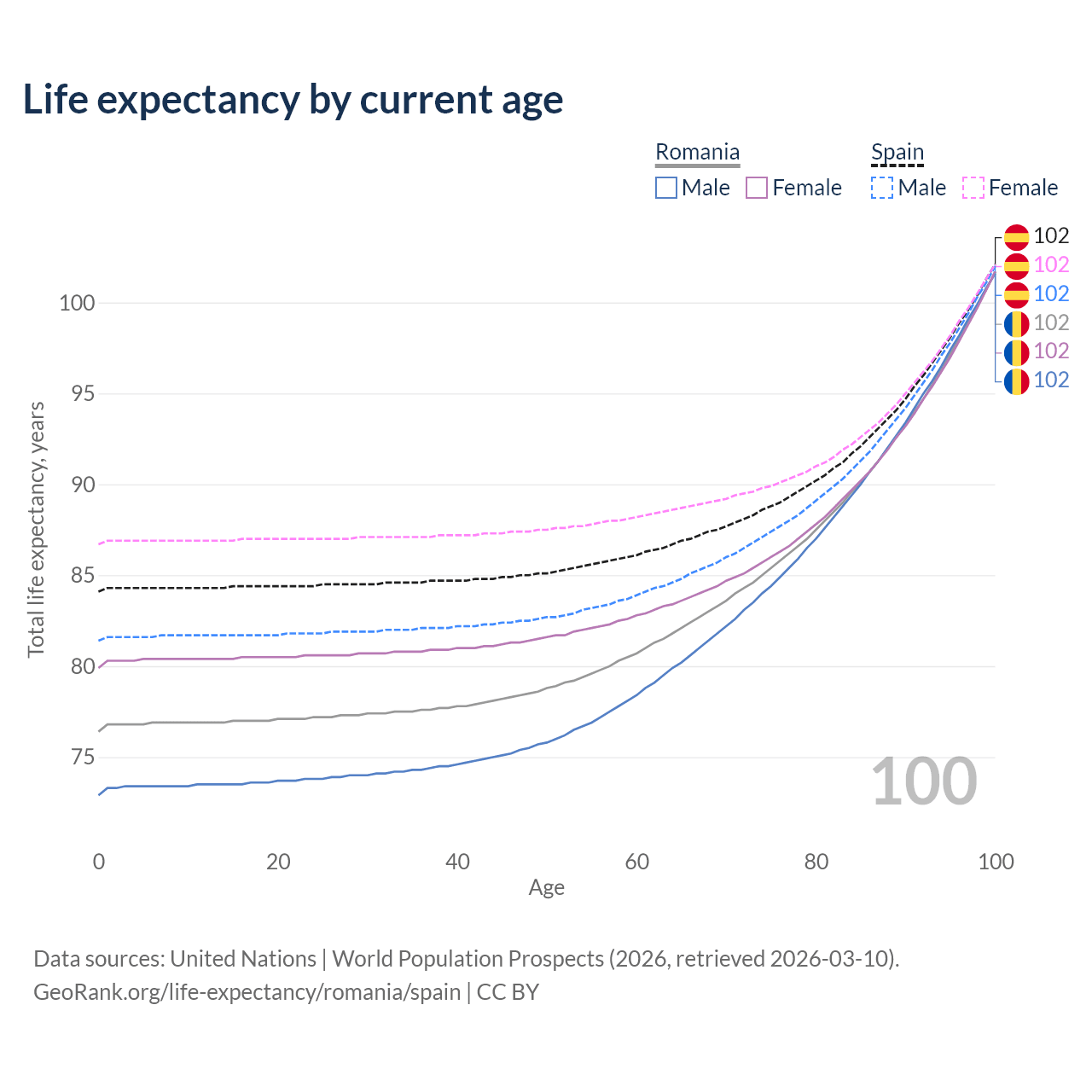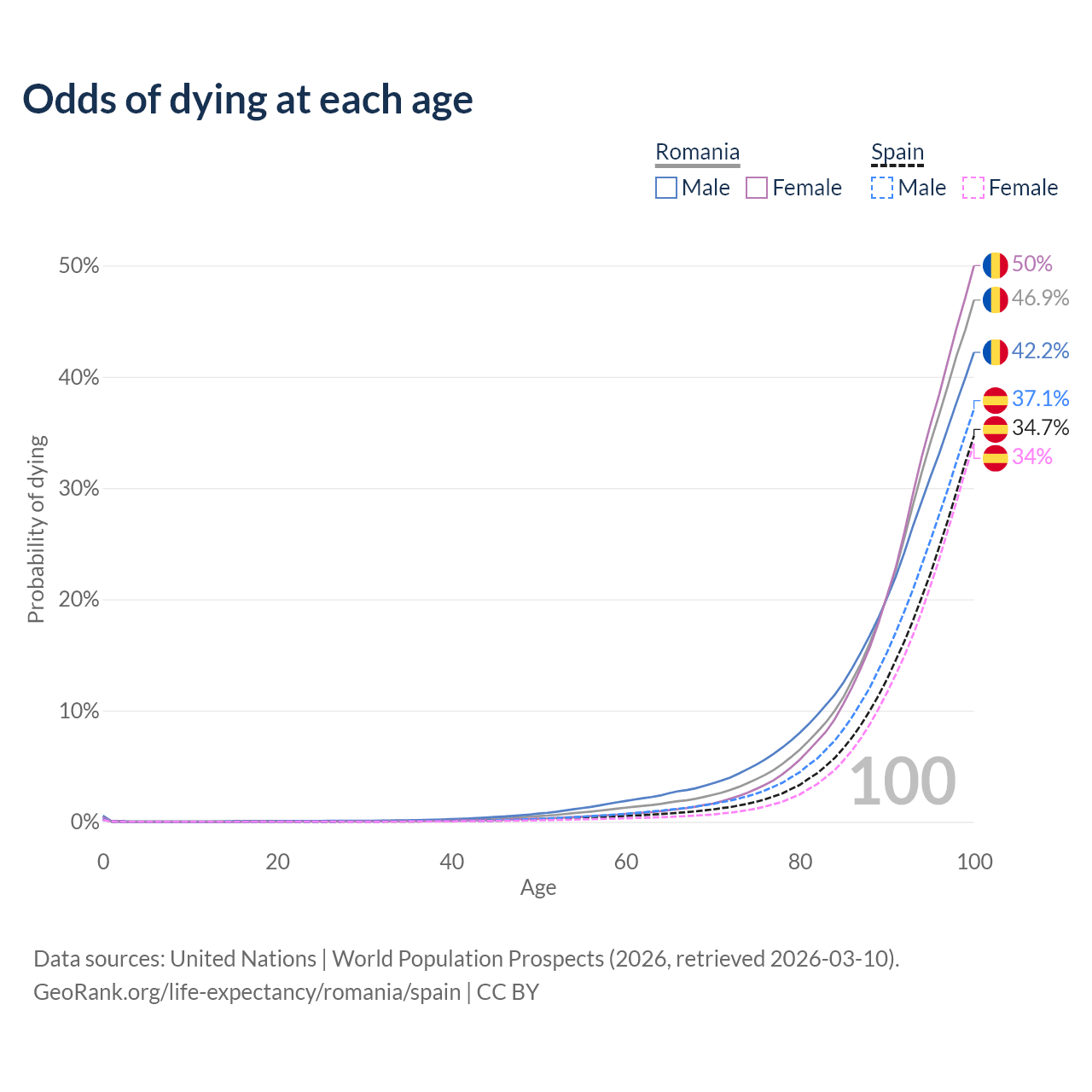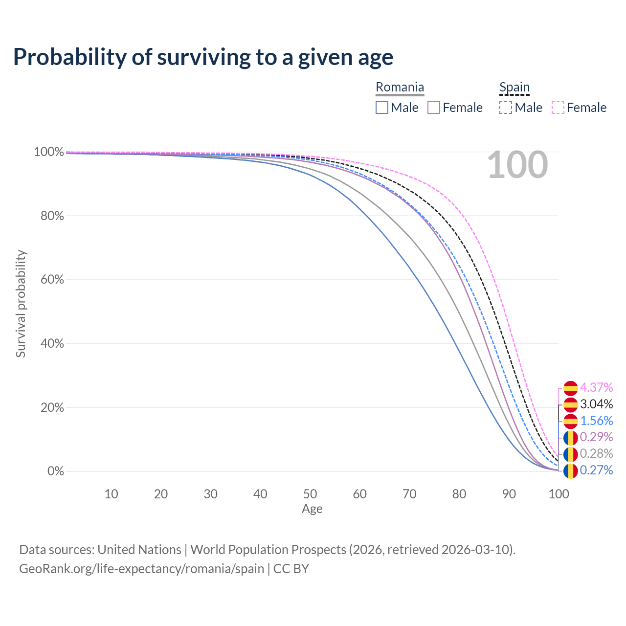 This life expectancy calculator shows the odds of living to 100, 95, 90, and below based on current age for both males and females in Romania and Spain, along with mean and median age of death. The calculations are based on the 2026 life tables (actuarial tables) from the UN World Population Prospects.
