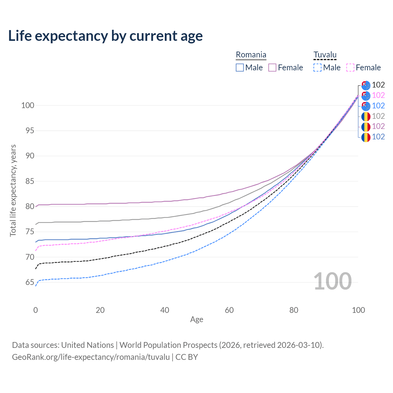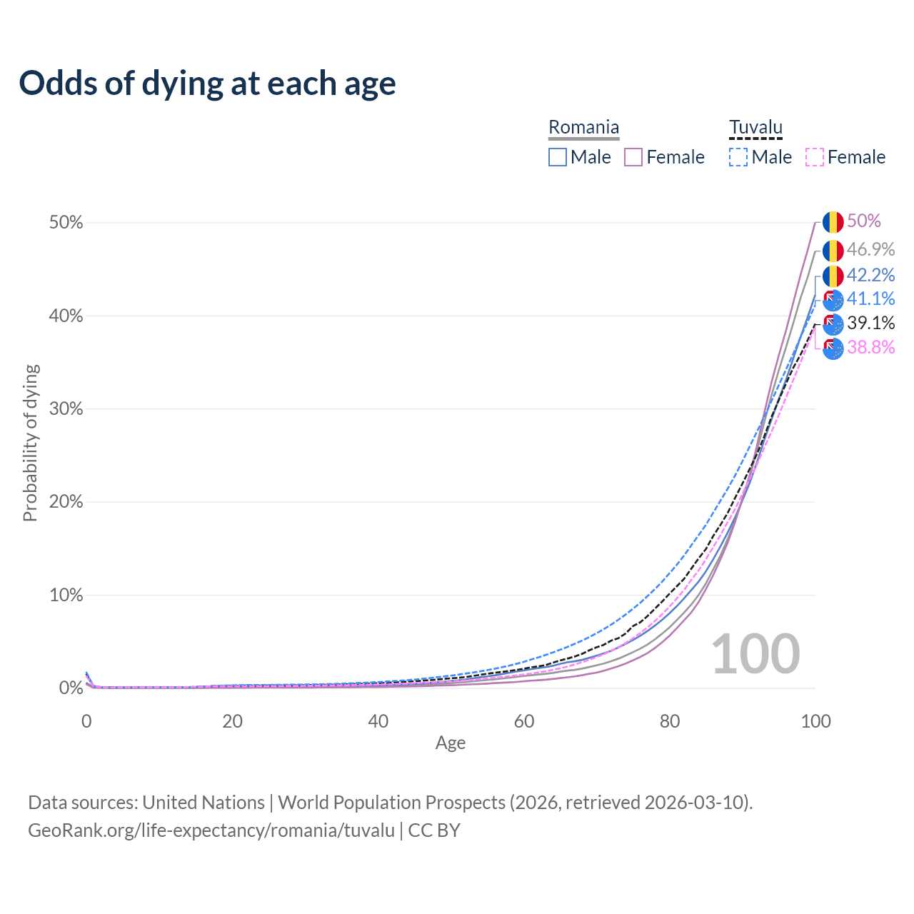 This life expectancy calculator shows the odds of living to 100, 95, 90, and below based on current age for both males and females in Romania and Tuvalu, along with mean and median age of death. The calculations are based on the 2026 life tables (actuarial tables) from the UN World Population Prospects.