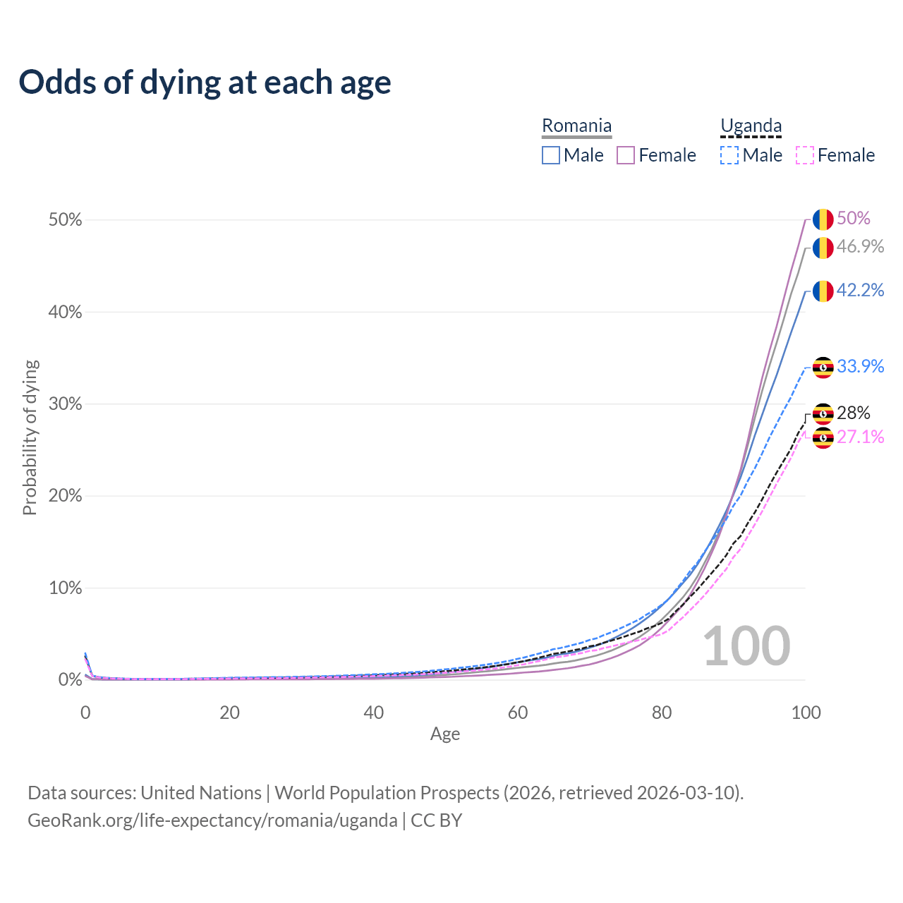 This life expectancy calculator shows the odds of living to 100, 95, 90, and below based on current age for both males and females in Romania and Uganda, along with mean and median age of death. The calculations are based on the 2026 life tables (actuarial tables) from the UN World Population Prospects.