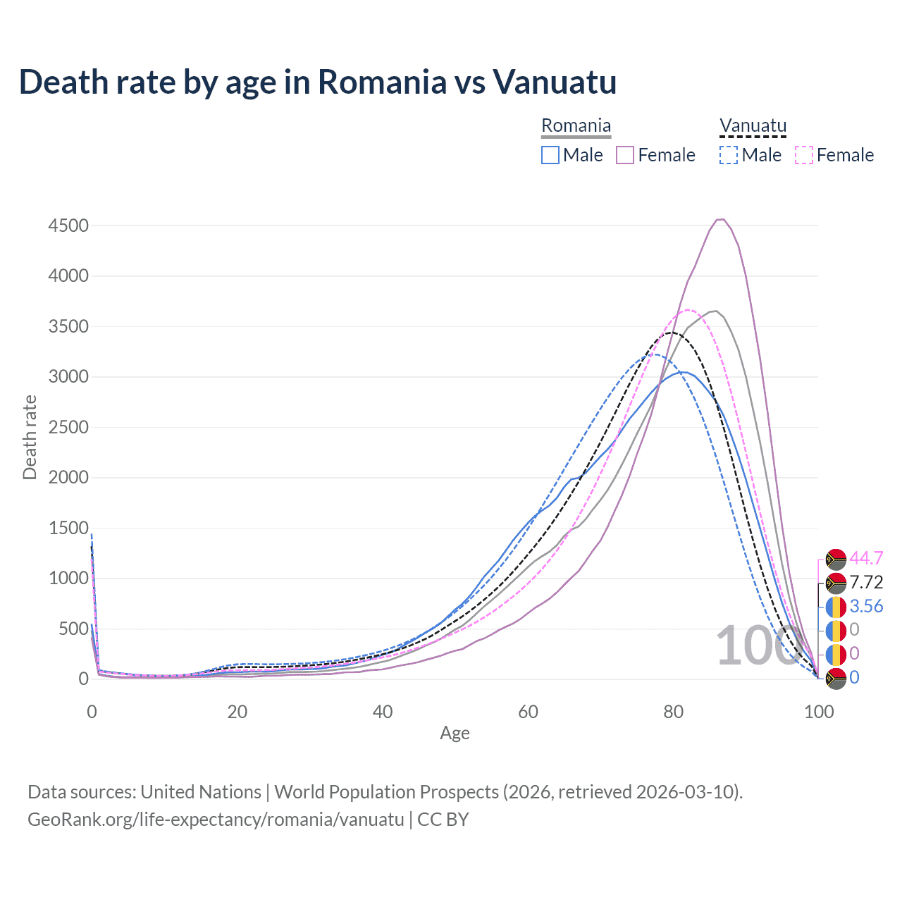 This life expectancy calculator shows the odds of living to 100, 95, 90, and below based on current age for both males and females in Romania and Vanuatu, along with mean and median age of death. The calculations are based on the 2026 life tables (actuarial tables) from the UN World Population Prospects.