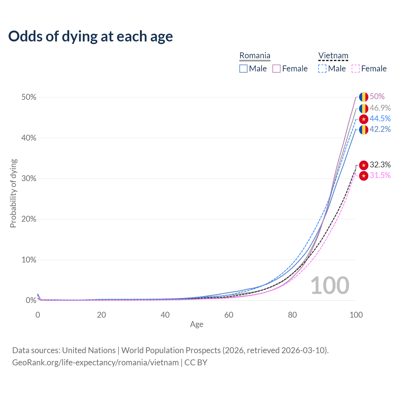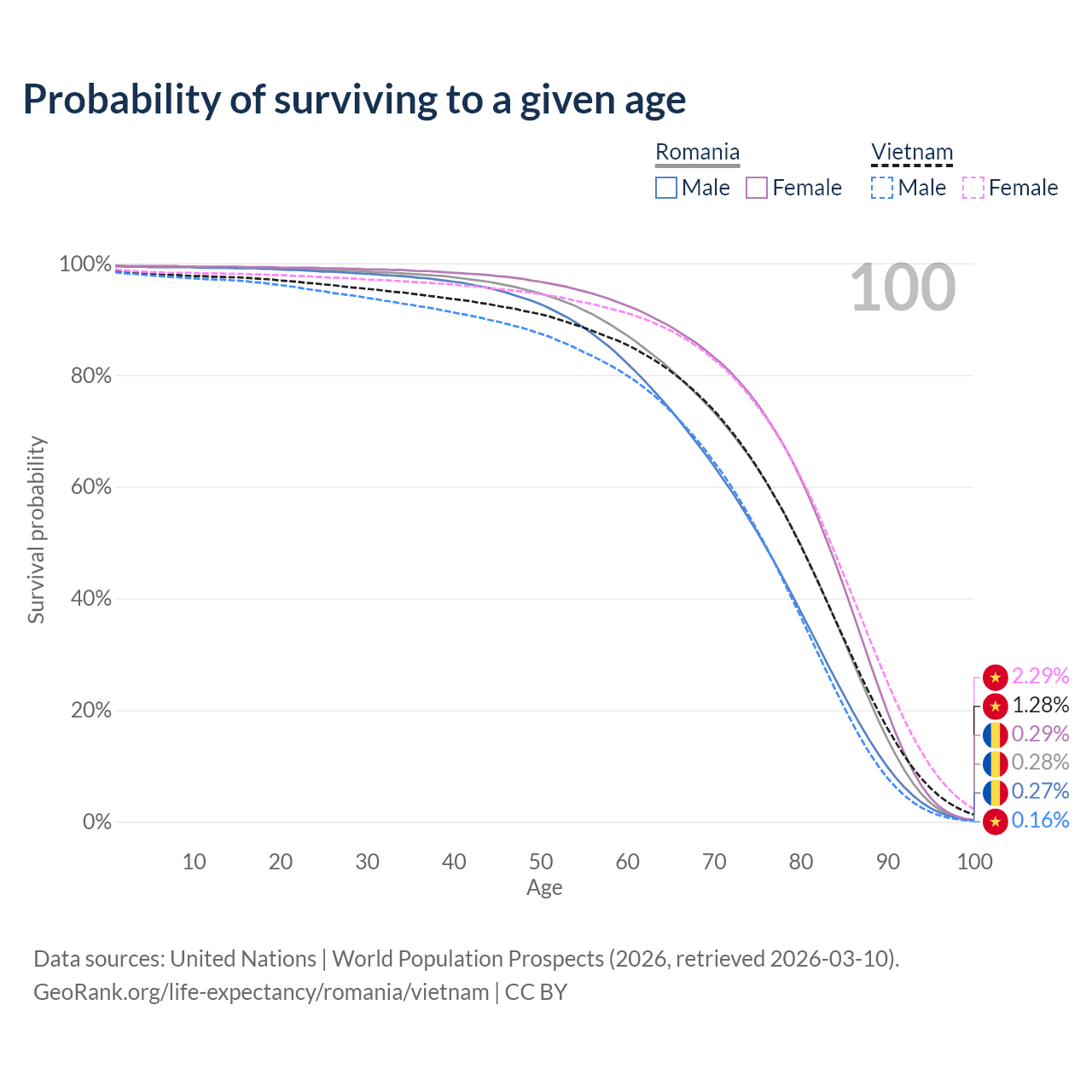 This life expectancy calculator shows the odds of living to 100, 95, 90, and below based on current age for both males and females in Romania and Vietnam, along with mean and median age of death. The calculations are based on the 2026 life tables (actuarial tables) from the UN World Population Prospects.