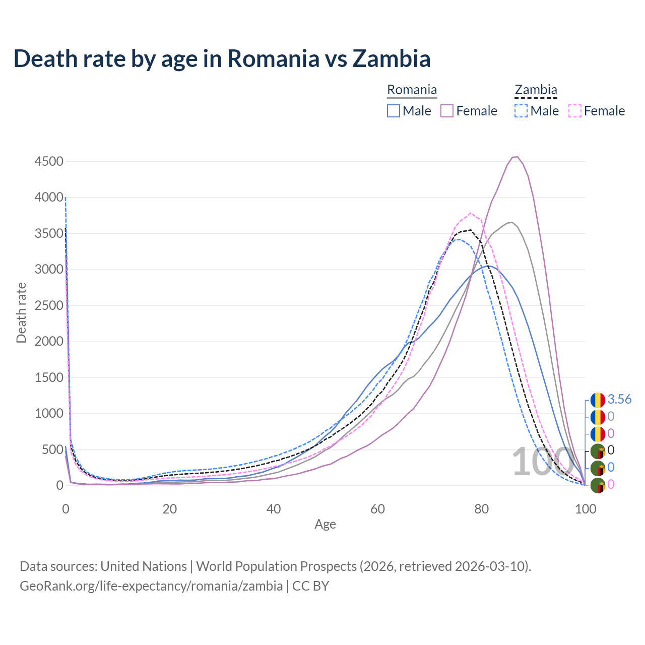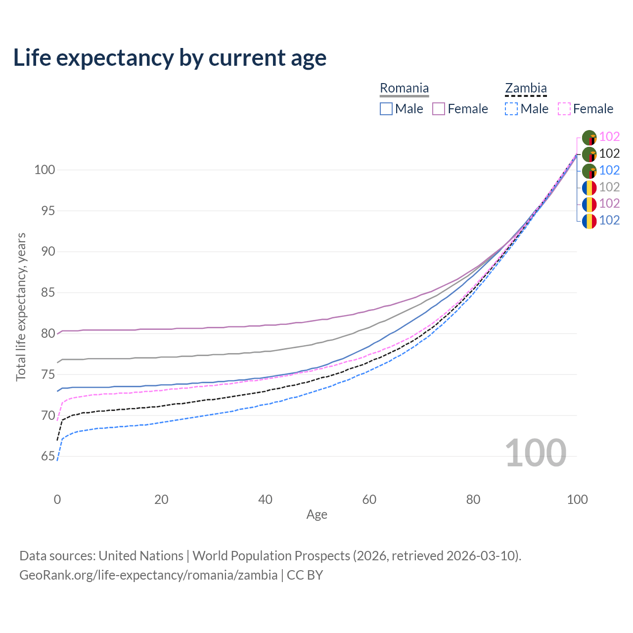 This life expectancy calculator shows the odds of living to 100, 95, 90, and below based on current age for both males and females in Romania and Zambia, along with mean and median age of death. The calculations are based on the 2026 life tables (actuarial tables) from the UN World Population Prospects.