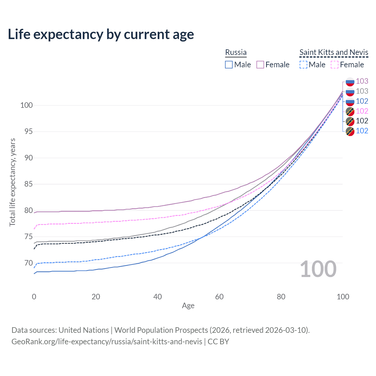 This life expectancy calculator shows the odds of living to 100, 95, 90, and below based on current age for both males and females in Russia and Saint Kitts and Nevis, along with mean and median age of death. The calculations are based on the 2026 life tables (actuarial tables) from the UN World Population Prospects.