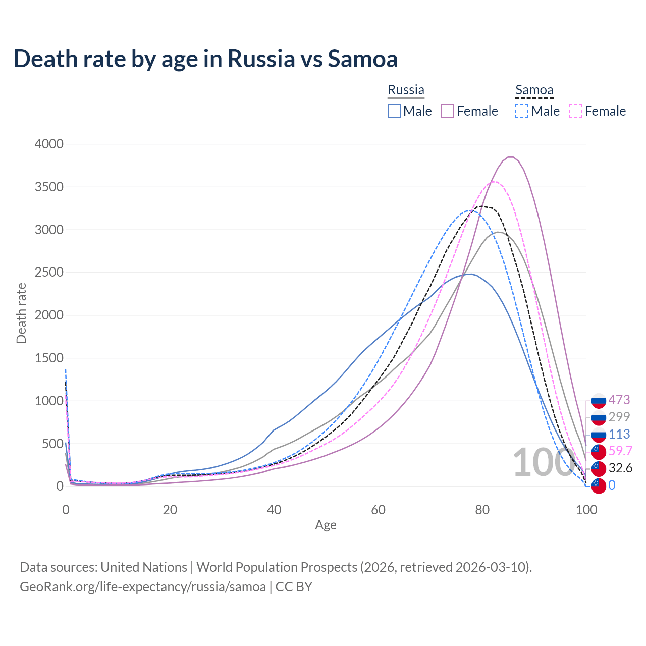 This life expectancy calculator shows the odds of living to 100, 95, 90, and below based on current age for both males and females in Russia and Samoa, along with mean and median age of death. The calculations are based on the 2026 life tables (actuarial tables) from the UN World Population Prospects.