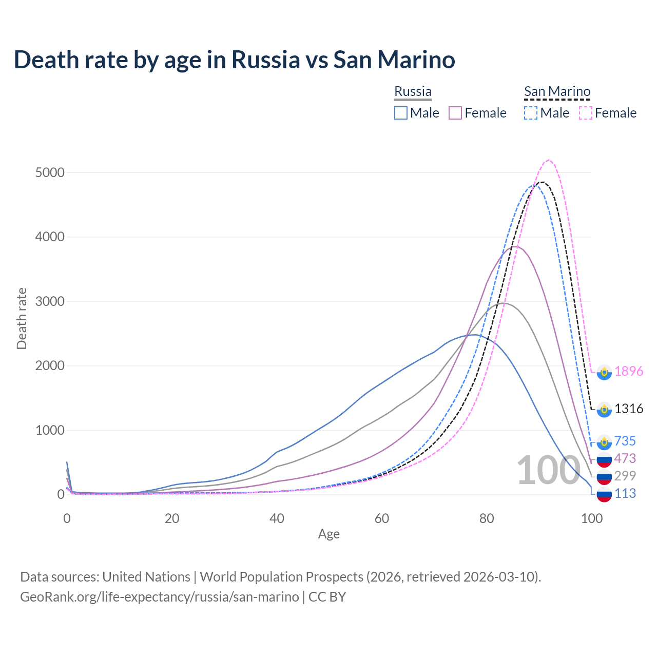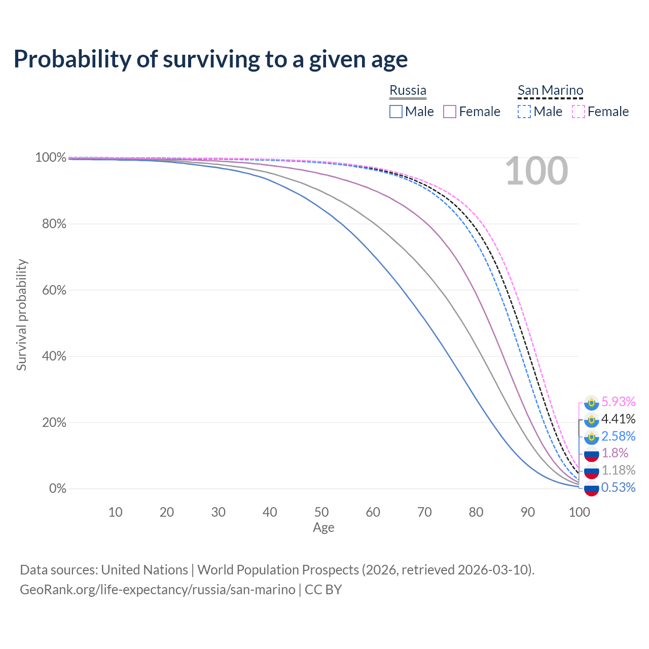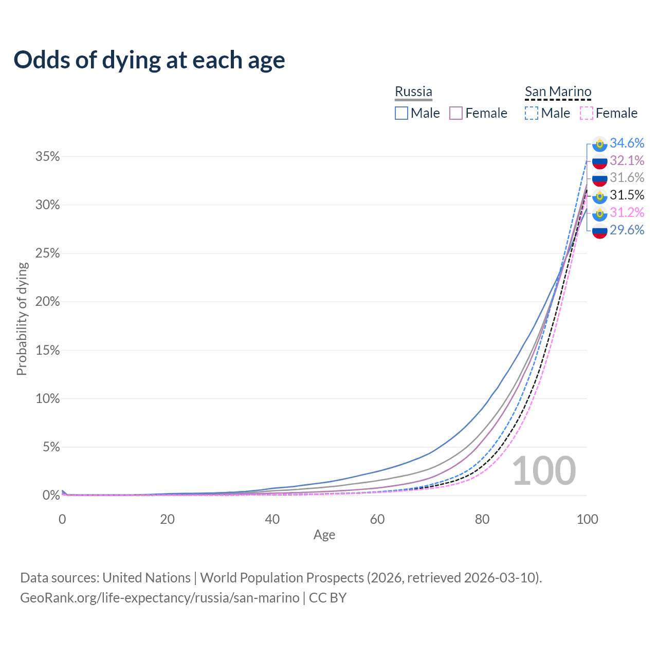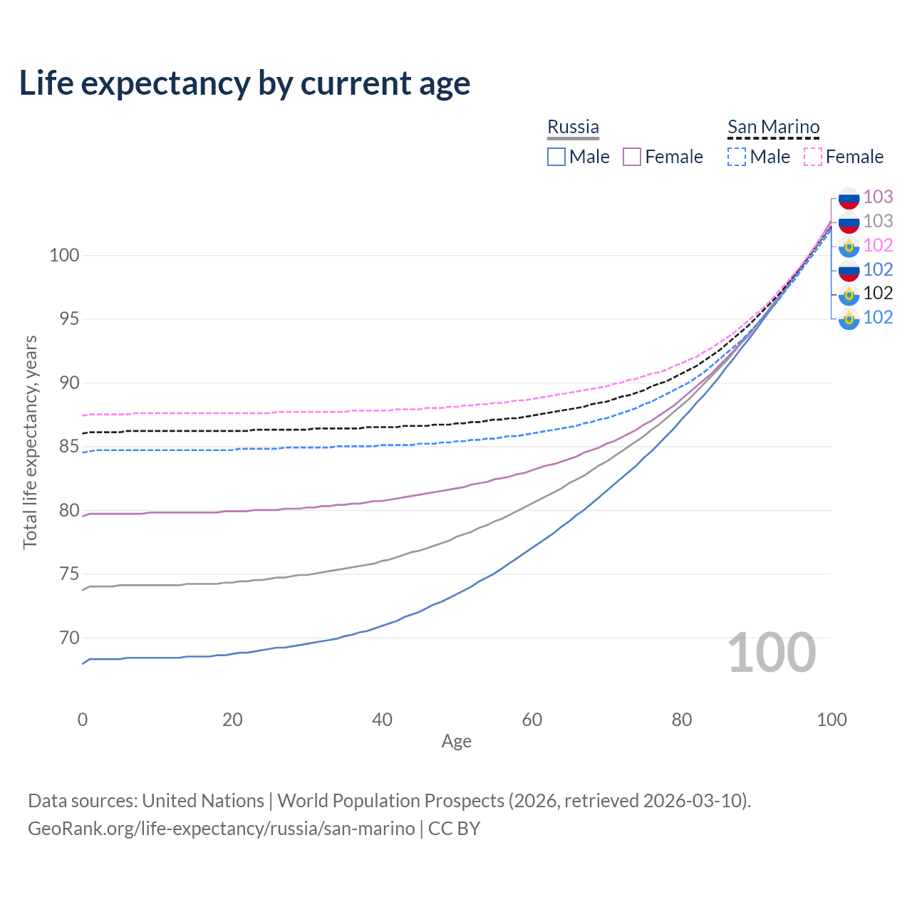 This life expectancy calculator shows the odds of living to 100, 95, 90, and below based on current age for both males and females in Russia and San Marino, along with mean and median age of death. The calculations are based on the 2026 life tables (actuarial tables) from the UN World Population Prospects.