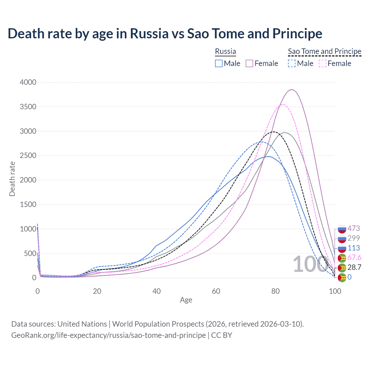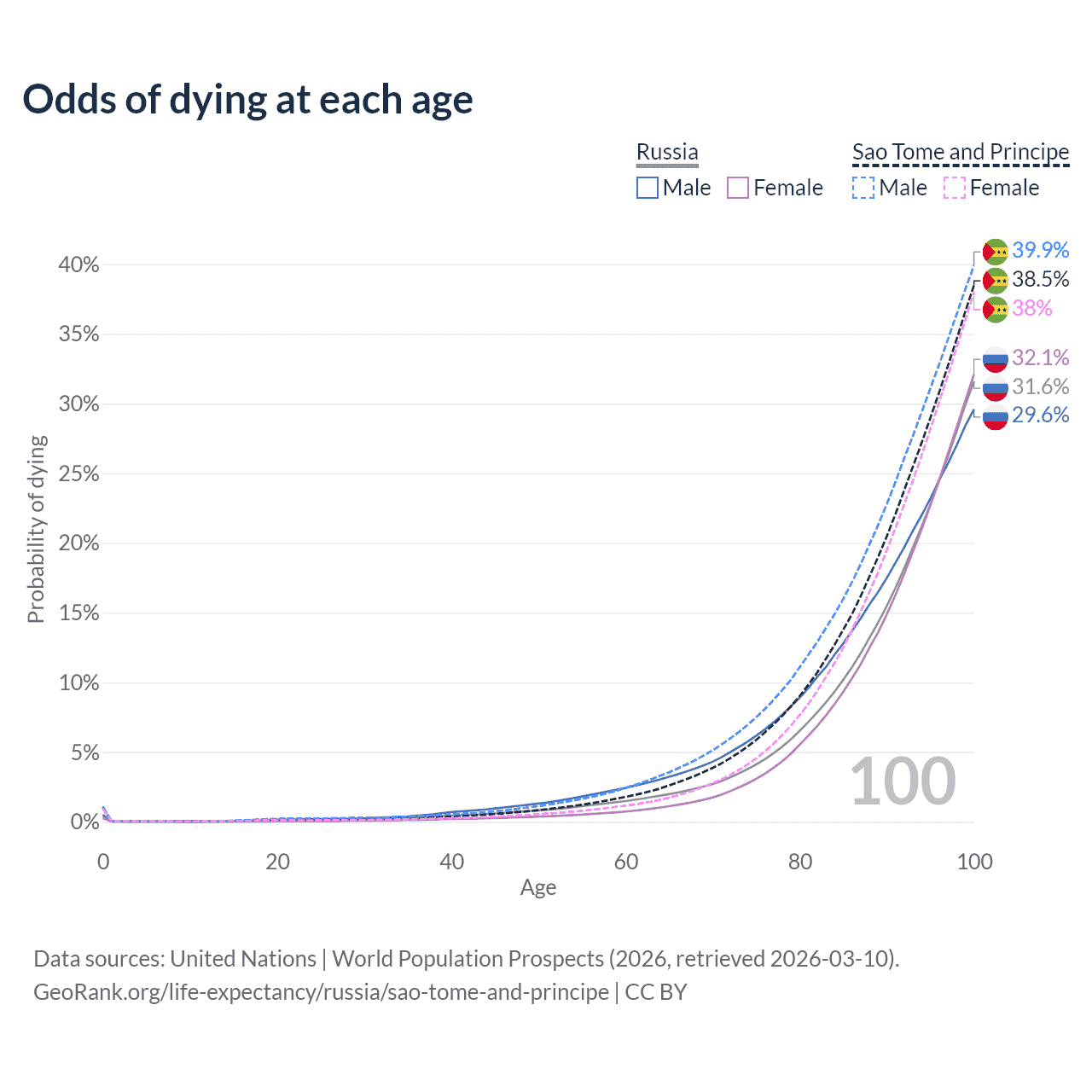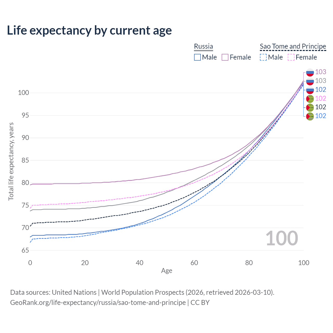 This life expectancy calculator shows the odds of living to 100, 95, 90, and below based on current age for both males and females in Russia and Sao Tome and Principe, along with mean and median age of death. The calculations are based on the 2026 life tables (actuarial tables) from the UN World Population Prospects.