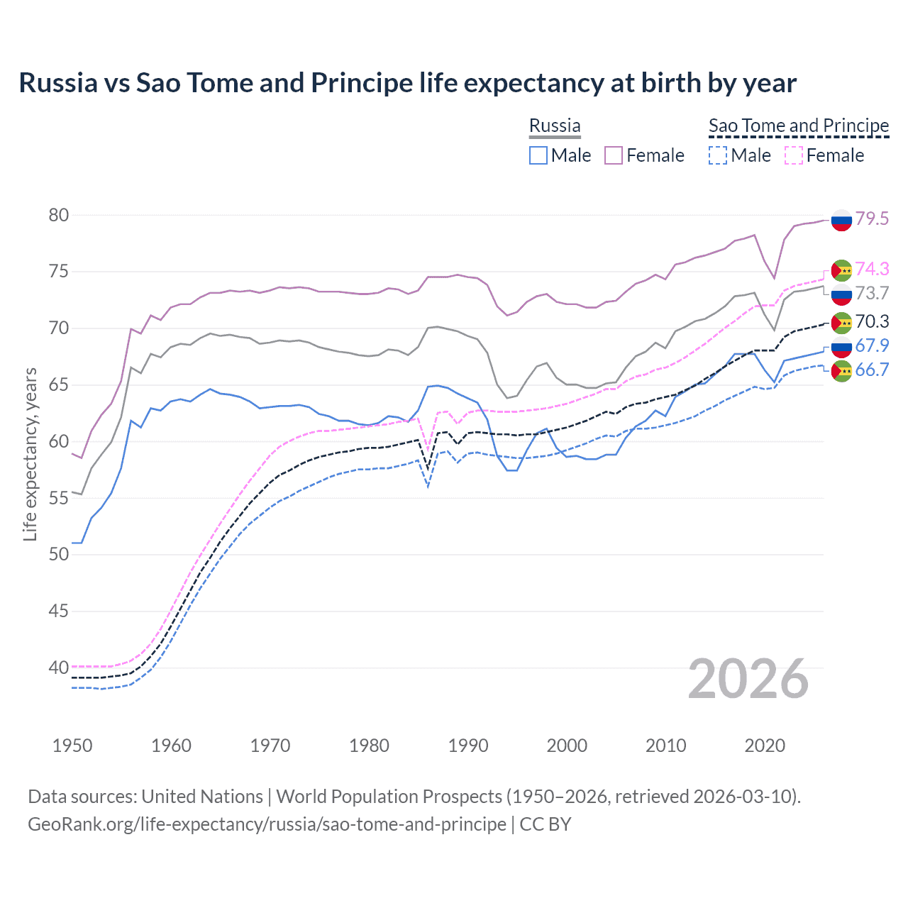 The average life expectancy at birth is 73.7 years in Russia vs 70.3 in Sao Tome and Principe. Russia is ranked 107/197 by life expectancy, and Sao Tome and Principe is 136/197. In Russia, the life expectancy is 67.9 years for males and 79.5 years for females. In Sao Tome and Principe, it's 66.7 years for males and 74.3 years for females.