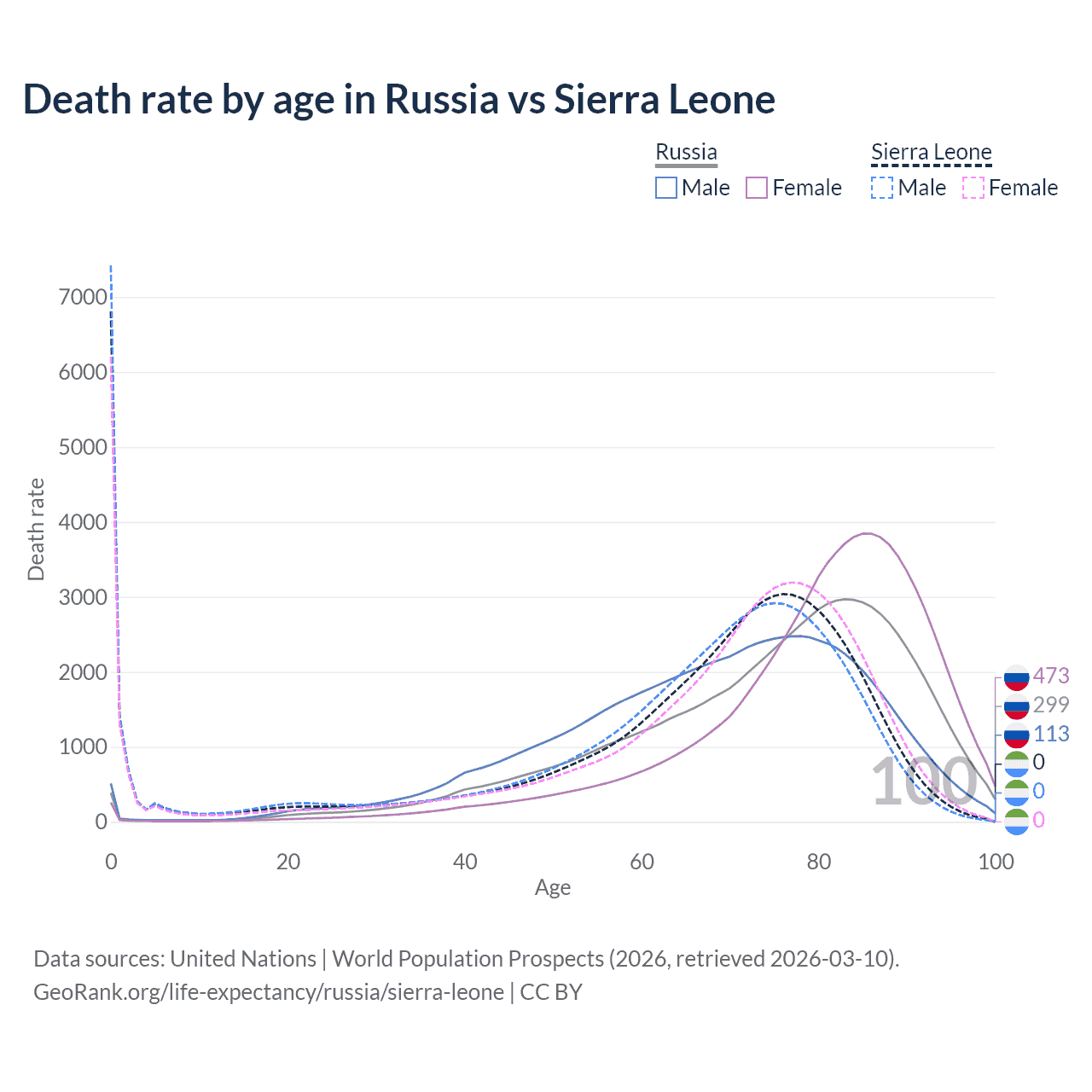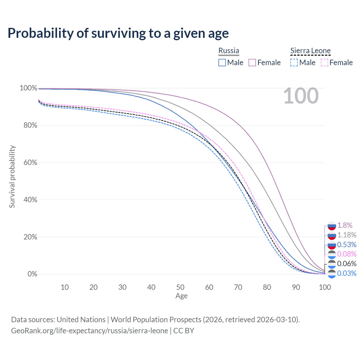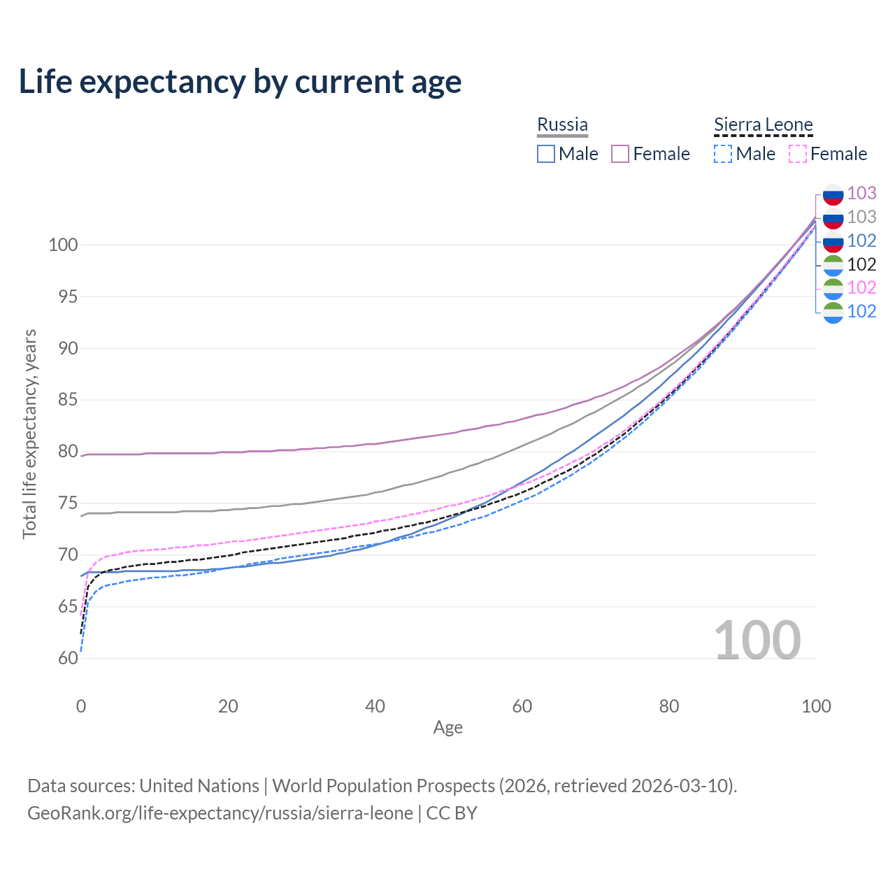 This life expectancy calculator shows the odds of living to 100, 95, 90, and below based on current age for both males and females in Russia and Sierra Leone, along with mean and median age of death. The calculations are based on the 2026 life tables (actuarial tables) from the UN World Population Prospects.