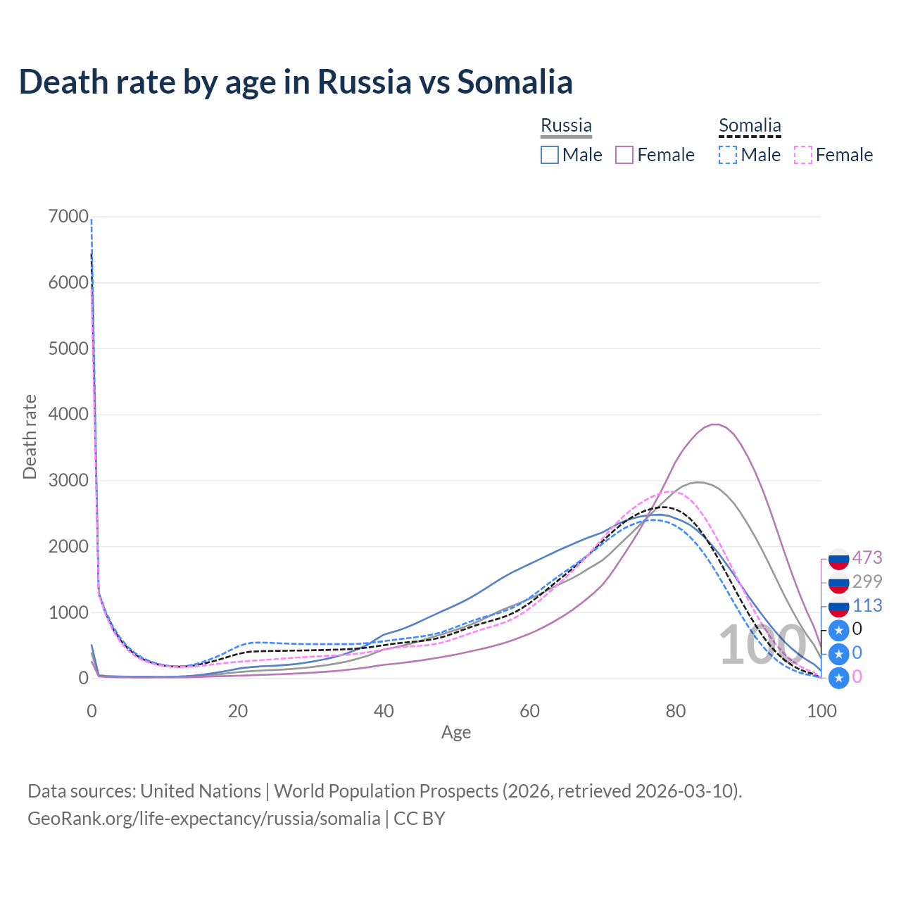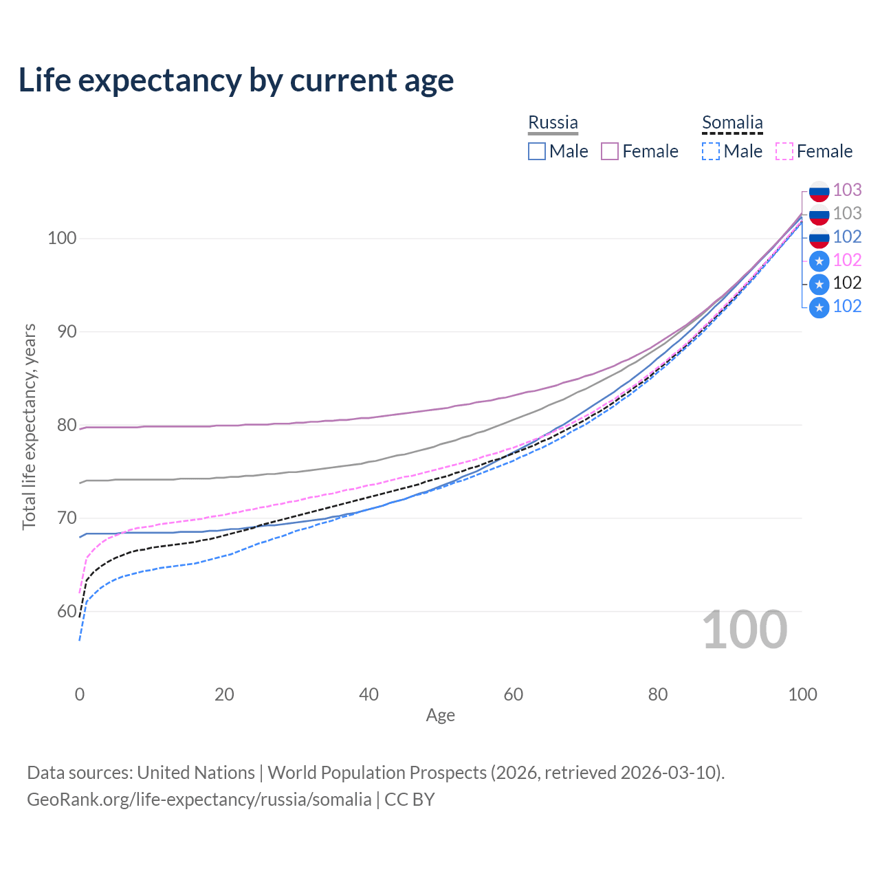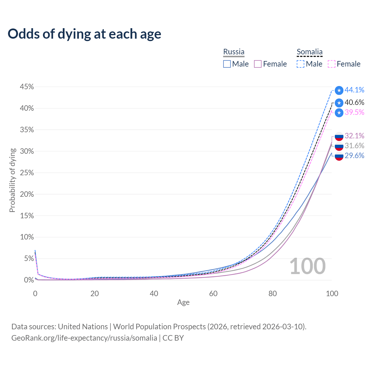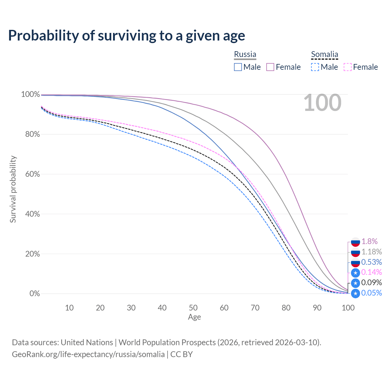 This life expectancy calculator shows the odds of living to 100, 95, 90, and below based on current age for both males and females in Russia and Somalia, along with mean and median age of death. The calculations are based on the 2026 life tables (actuarial tables) from the UN World Population Prospects.