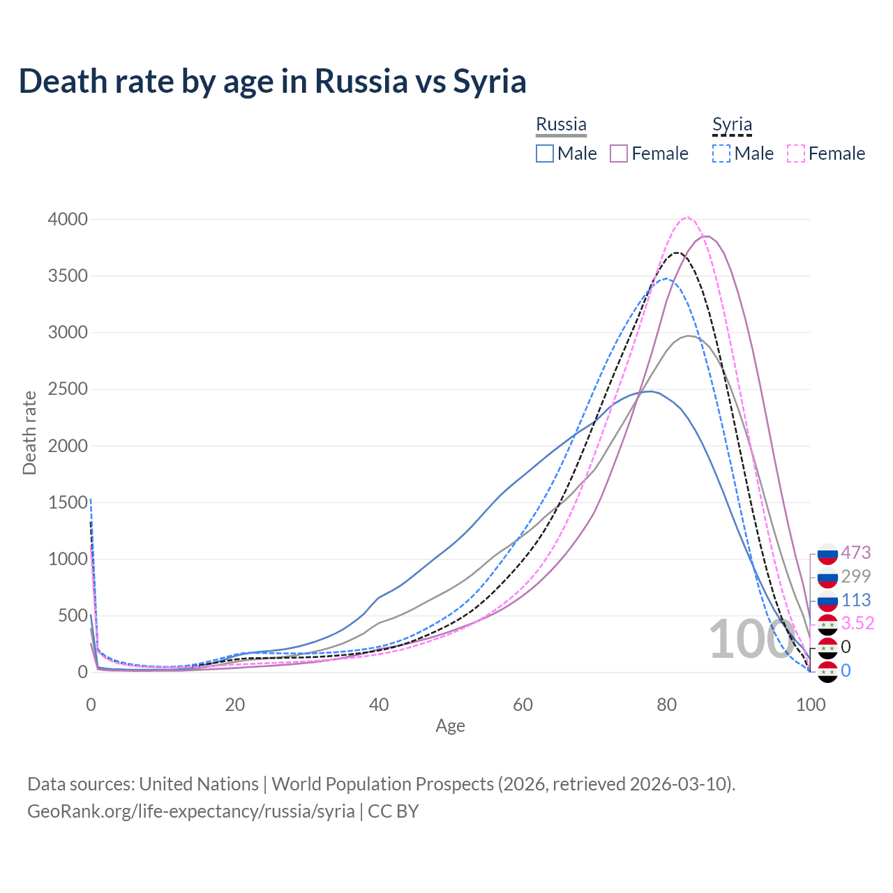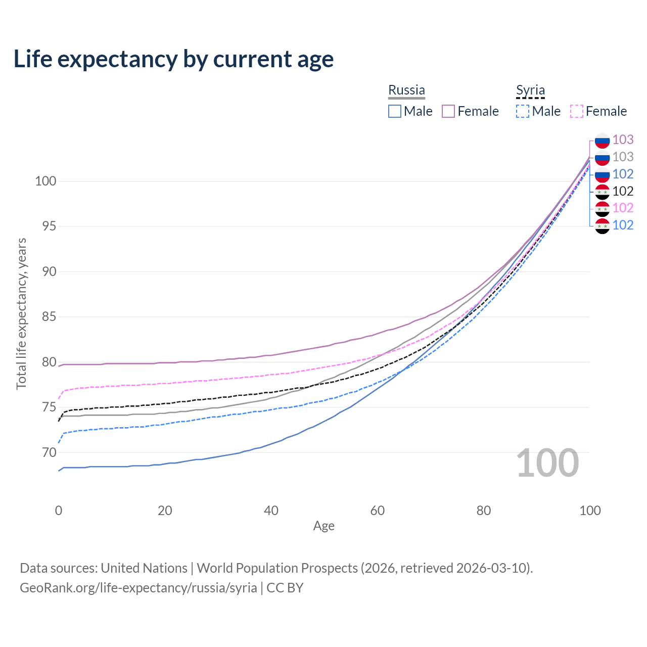 This life expectancy calculator shows the odds of living to 100, 95, 90, and below based on current age for both males and females in Russia and Syria, along with mean and median age of death. The calculations are based on the 2026 life tables (actuarial tables) from the UN World Population Prospects.