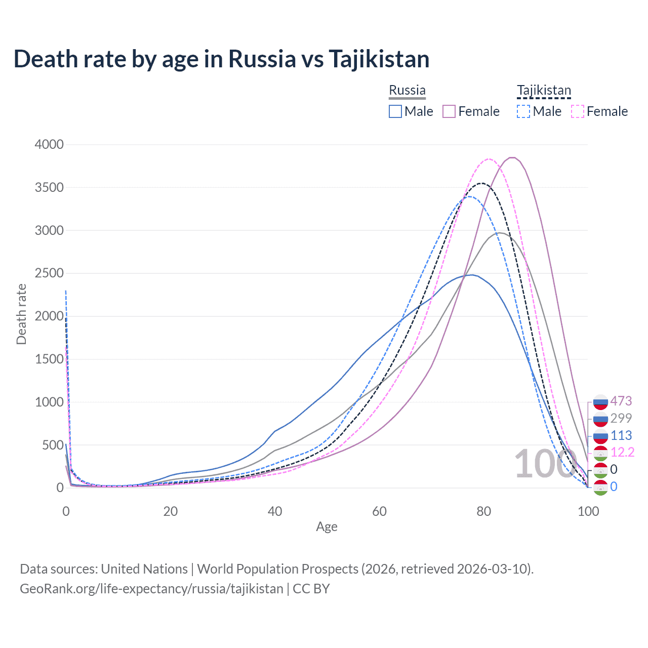 In Russia, the most common age of death is 83, compared to 80 in Tajikistan. The median age of death is 77.5 in Russia and 76 in Tajikistan, meaning only half of each cohort is expected to live past that age.
