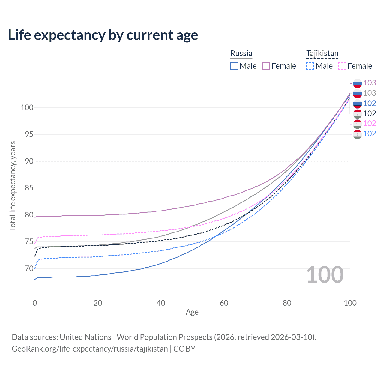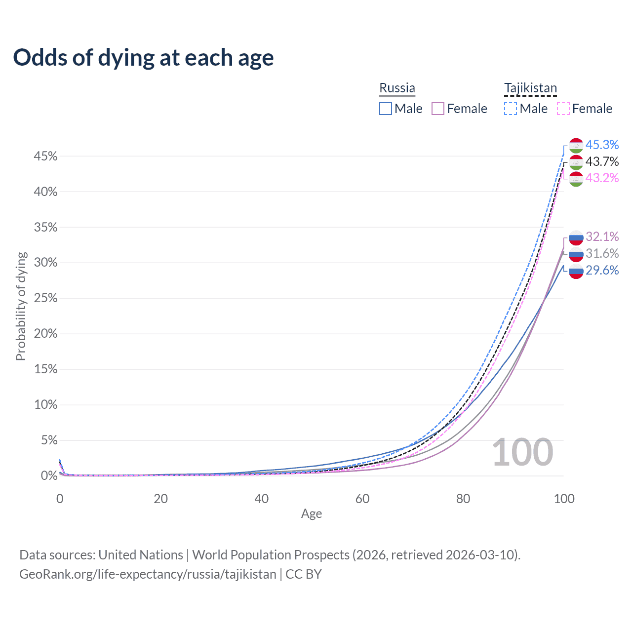This life expectancy calculator shows the odds of living to 100, 95, 90, and below based on current age for both males and females in Russia and Tajikistan, along with mean and median age of death. The calculations are based on the 2026 life tables (actuarial tables) from the UN World Population Prospects.