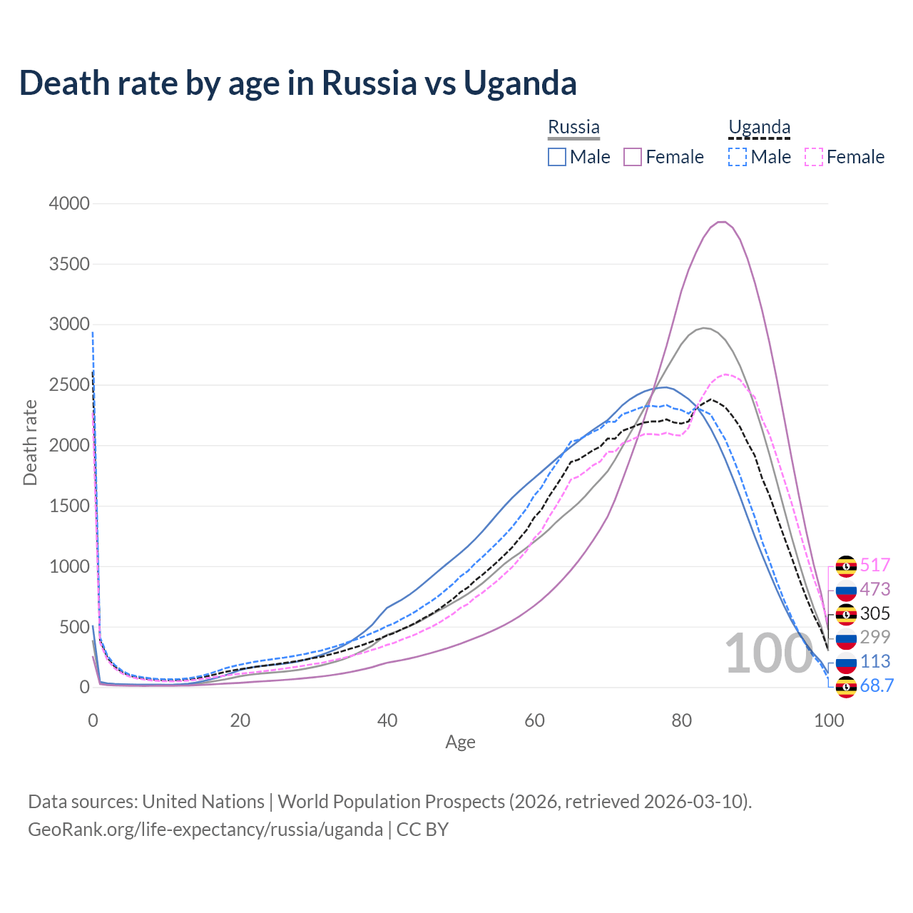 The average life expectancy at birth is 73.7 years in Russia vs 68.9 in Uganda. Russia is ranked 107/197 by life expectancy, and Uganda is 146/197. In Russia, the life expectancy is 67.9 years for males and 79.5 years for females. In Uganda, it's 65.9 years for males and 71.8 years for females.