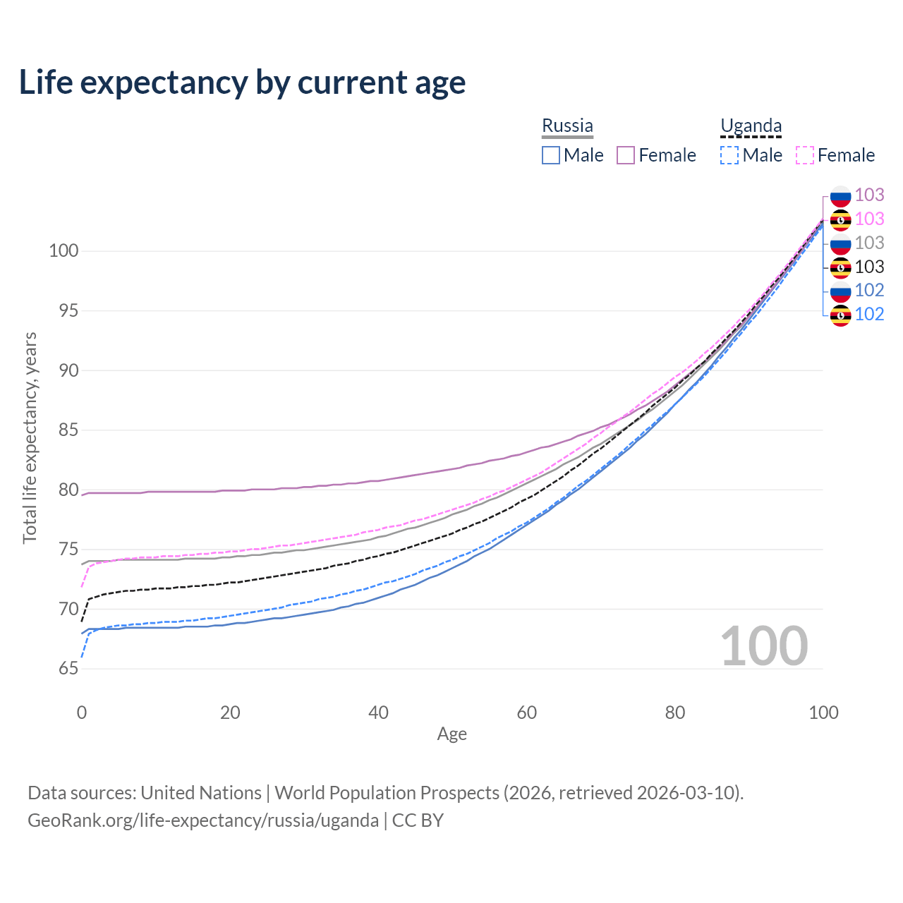 This life expectancy calculator shows the odds of living to 100, 95, 90, and below based on current age for both males and females in Russia and Uganda, along with mean and median age of death. The calculations are based on the 2026 life tables (actuarial tables) from the UN World Population Prospects.