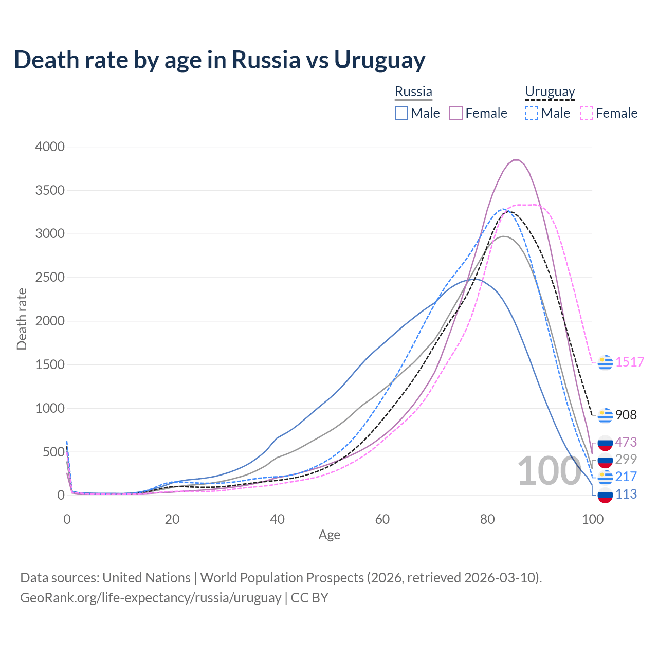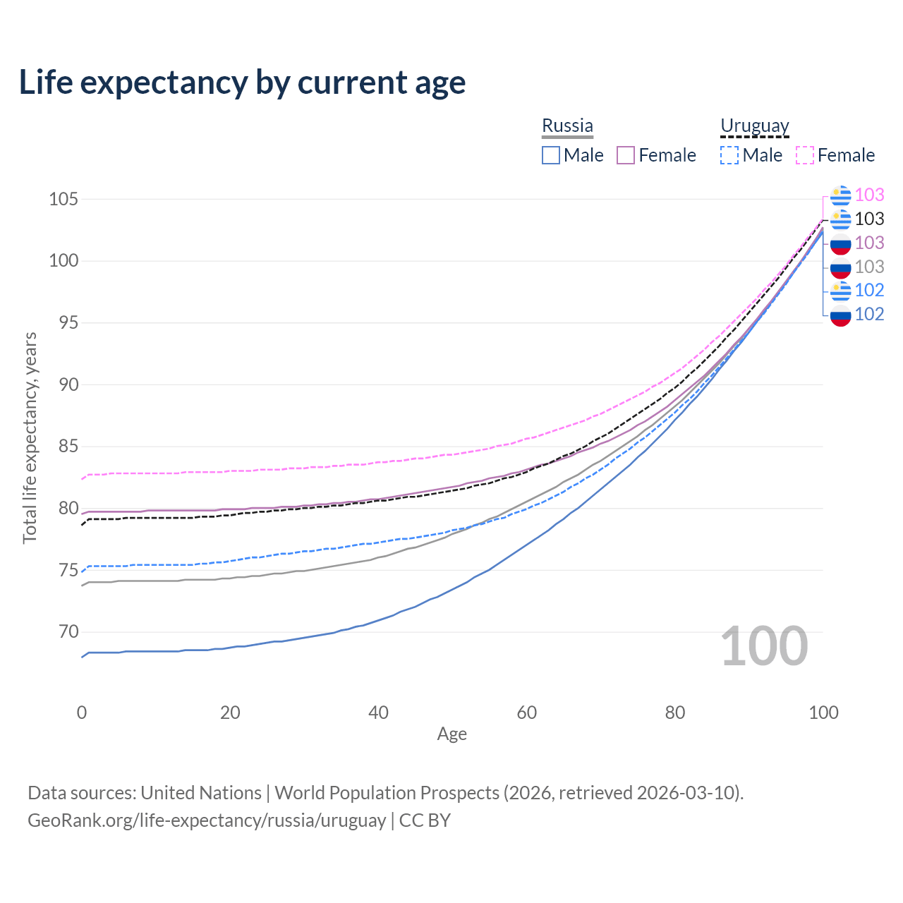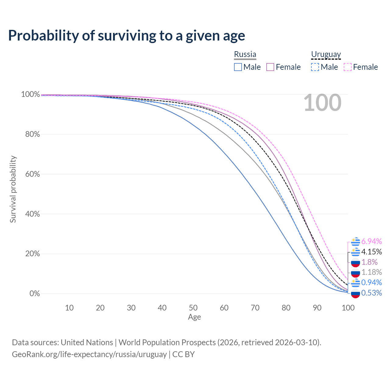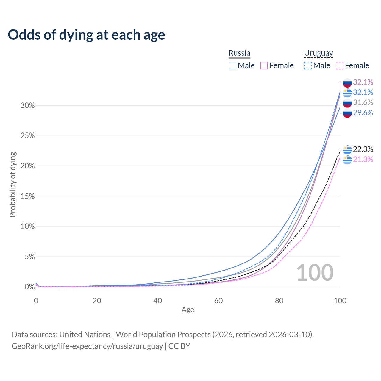 This life expectancy calculator shows the odds of living to 100, 95, 90, and below based on current age for both males and females in Russia and Uruguay, along with mean and median age of death. The calculations are based on the 2026 life tables (actuarial tables) from the UN World Population Prospects.