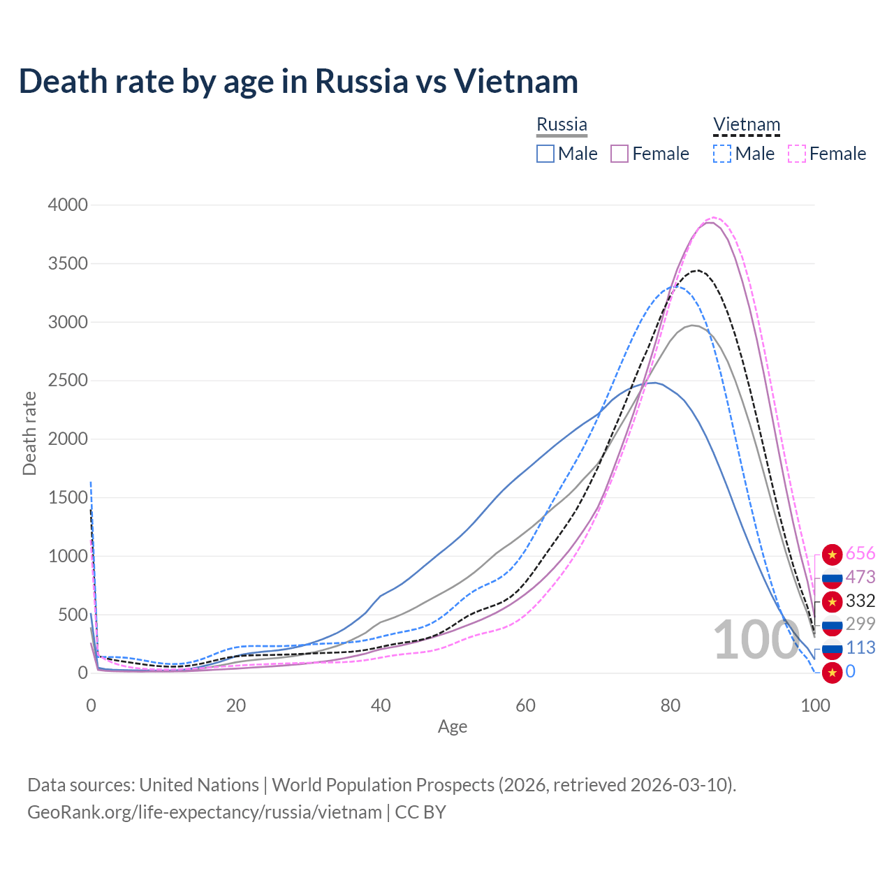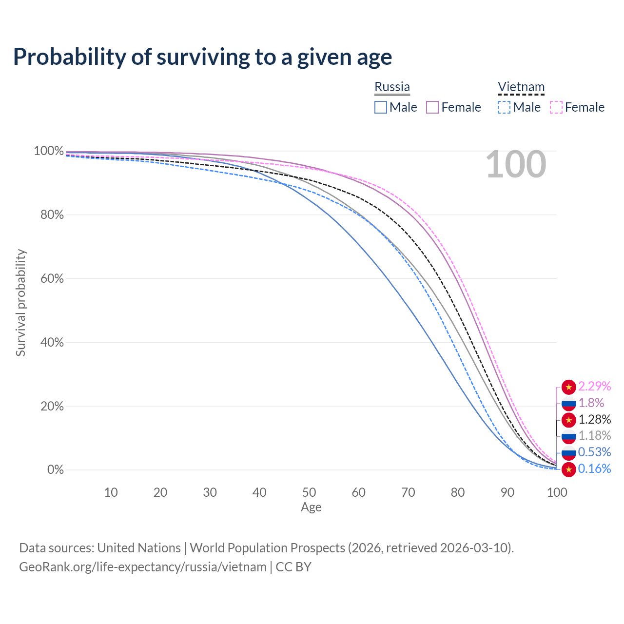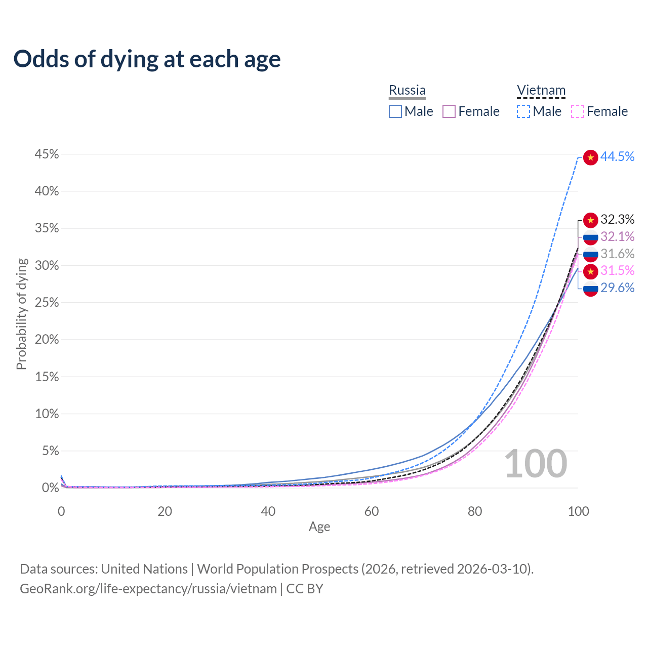 This life expectancy calculator shows the odds of living to 100, 95, 90, and below based on current age for both males and females in Russia and Vietnam, along with mean and median age of death. The calculations are based on the 2026 life tables (actuarial tables) from the UN World Population Prospects.