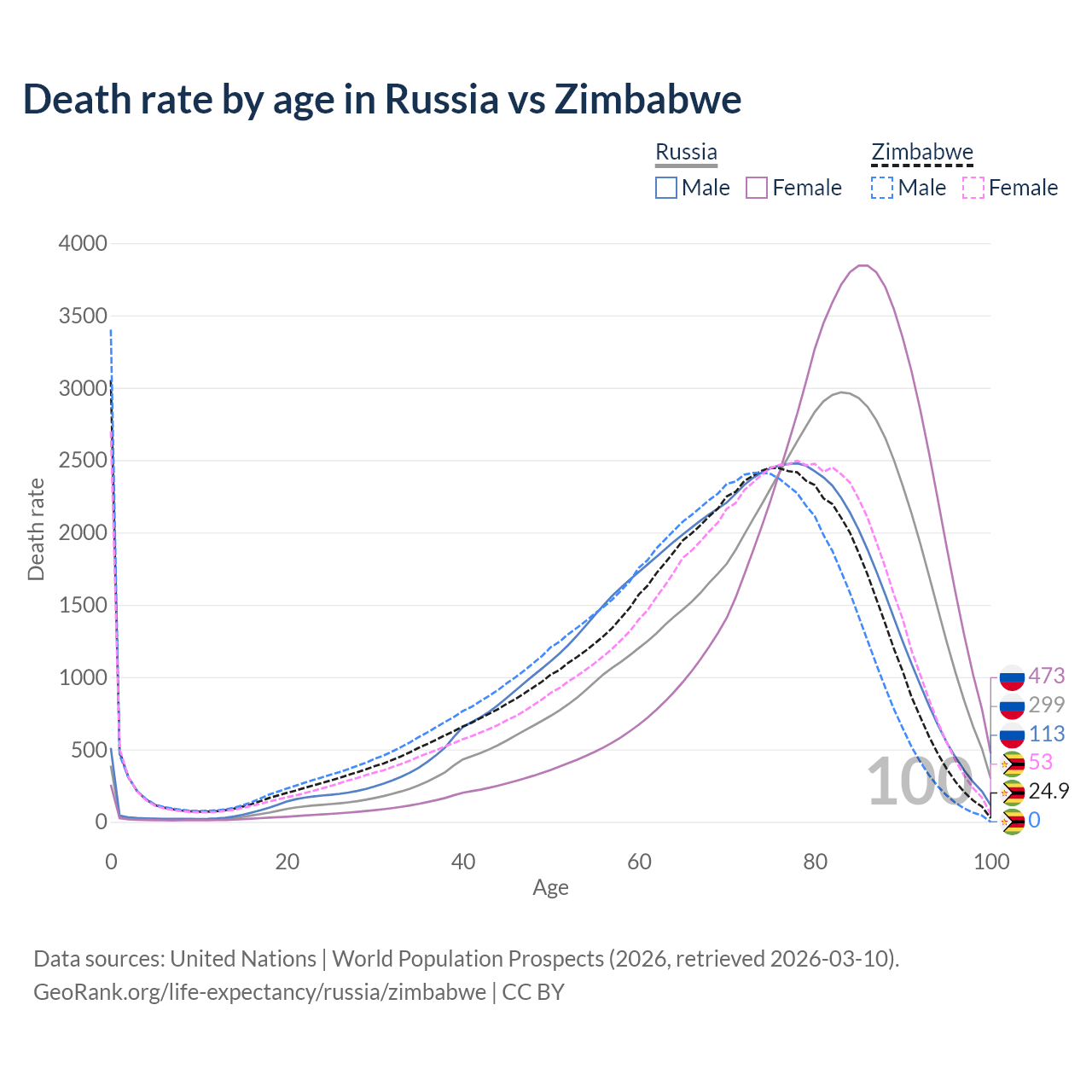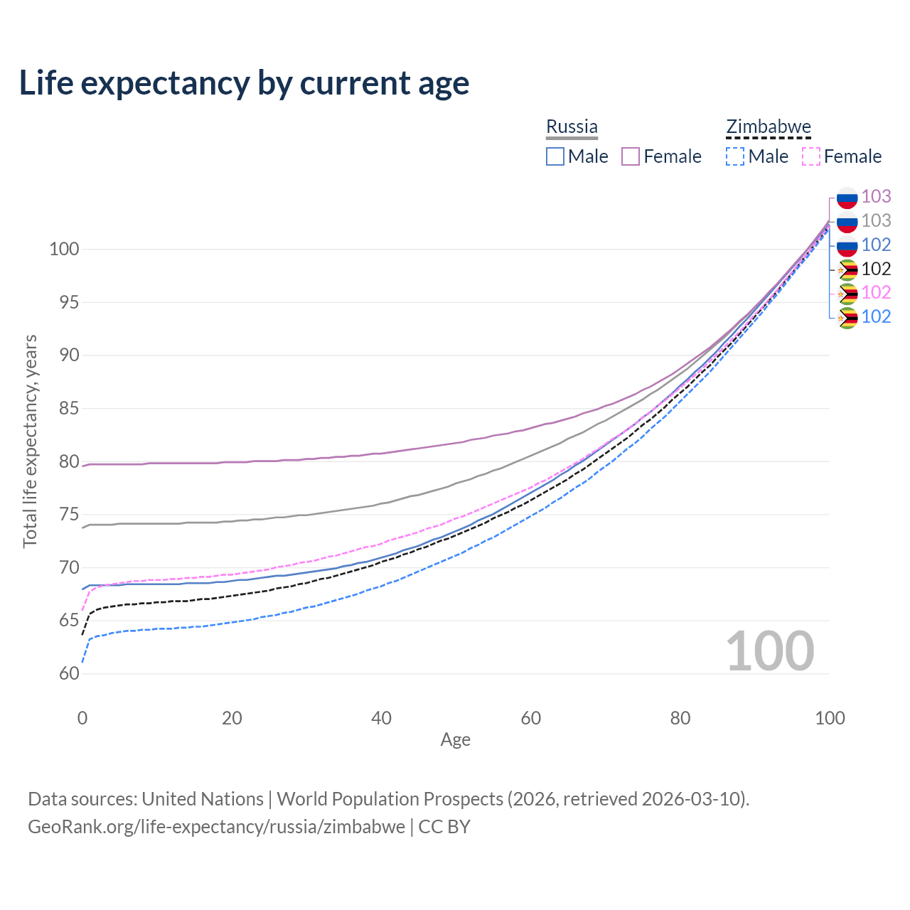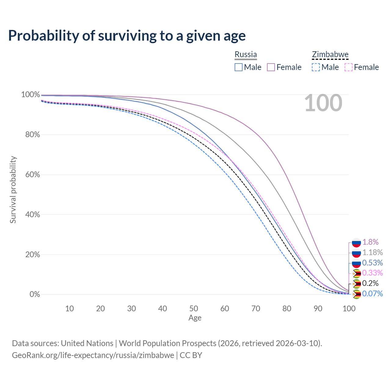 This life expectancy calculator shows the odds of living to 100, 95, 90, and below based on current age for both males and females in Russia and Zimbabwe, along with mean and median age of death. The calculations are based on the 2026 life tables (actuarial tables) from the UN World Population Prospects.
