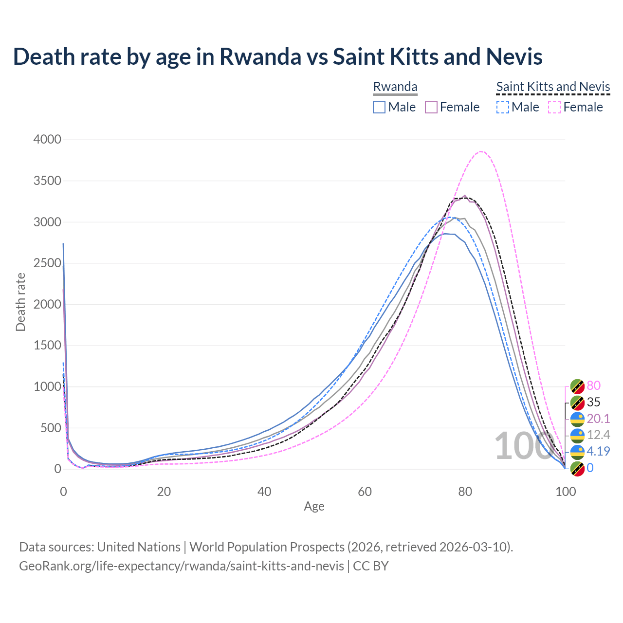 In Rwanda, the most common age of death is 78, compared to 80 in Saint Kitts and Nevis. The median age of death is 73.5 in Rwanda and 76.3 in Saint Kitts and Nevis, meaning only half of each cohort is expected to live past that age.