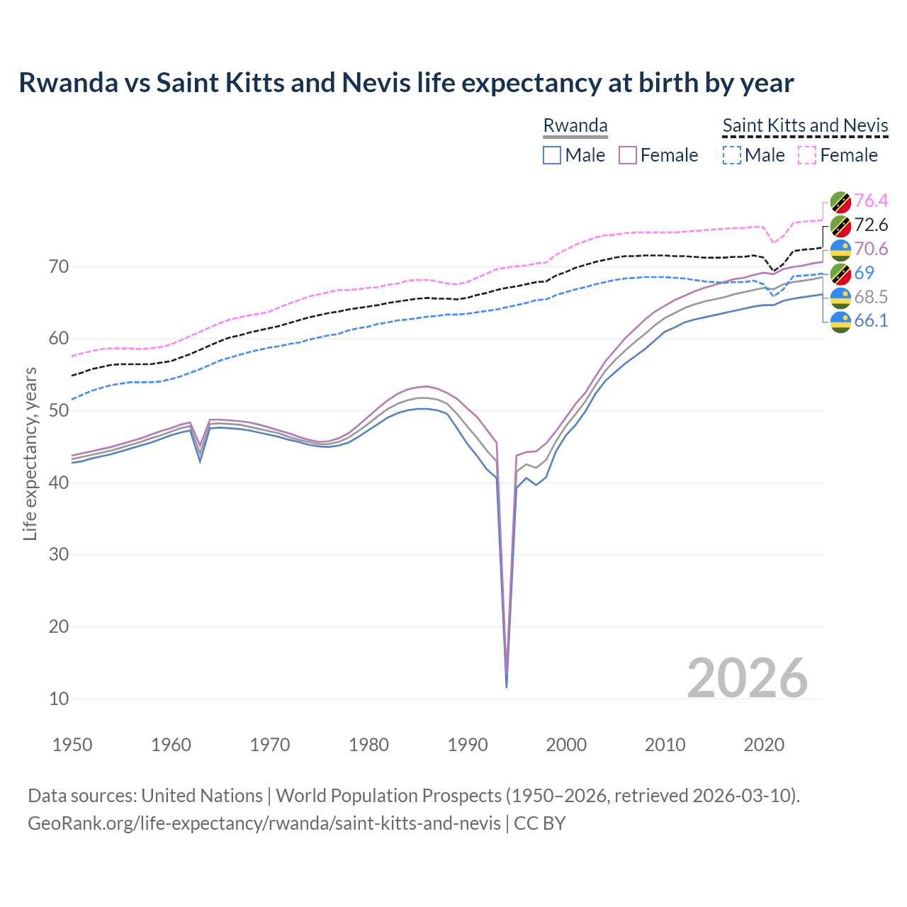 The average life expectancy at birth is 68.5 years in Rwanda vs 72.6 in Saint Kitts and Nevis. Rwanda is ranked 148/197 by life expectancy, and Saint Kitts and Nevis is 119/197. In Rwanda, the life expectancy is 66.1 years for males and 70.6 years for females. In Saint Kitts and Nevis, it's 69 years for males and 76.4 years for females.