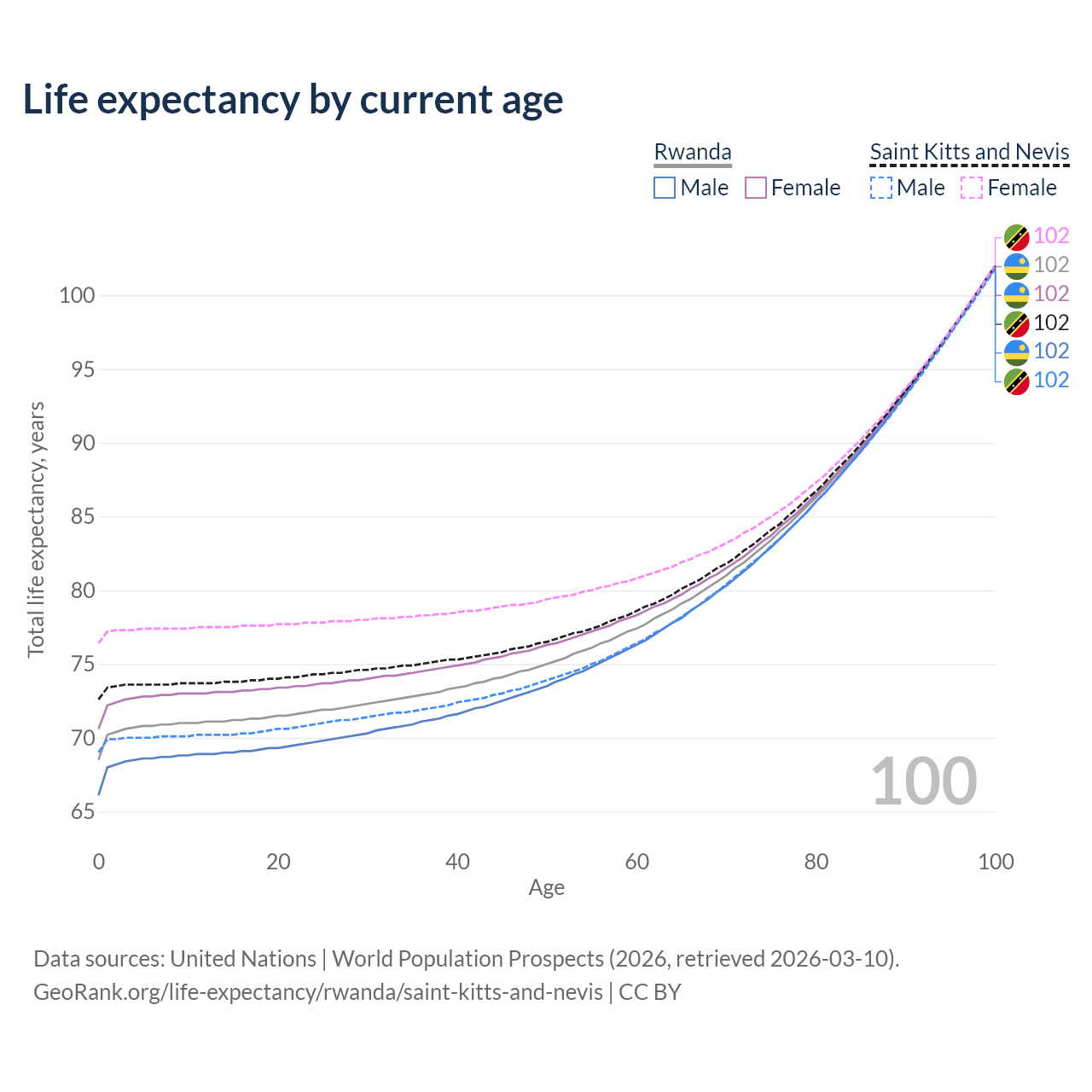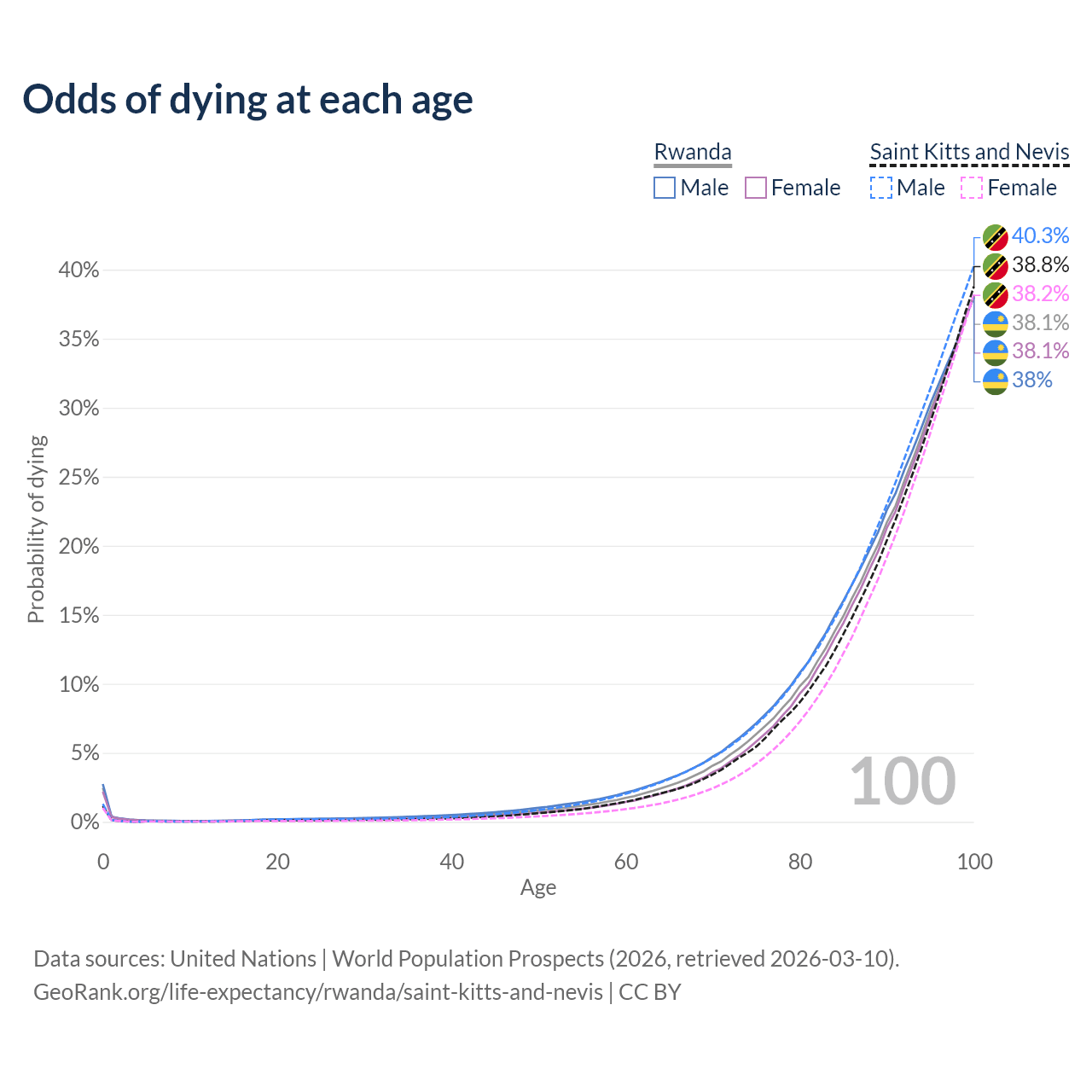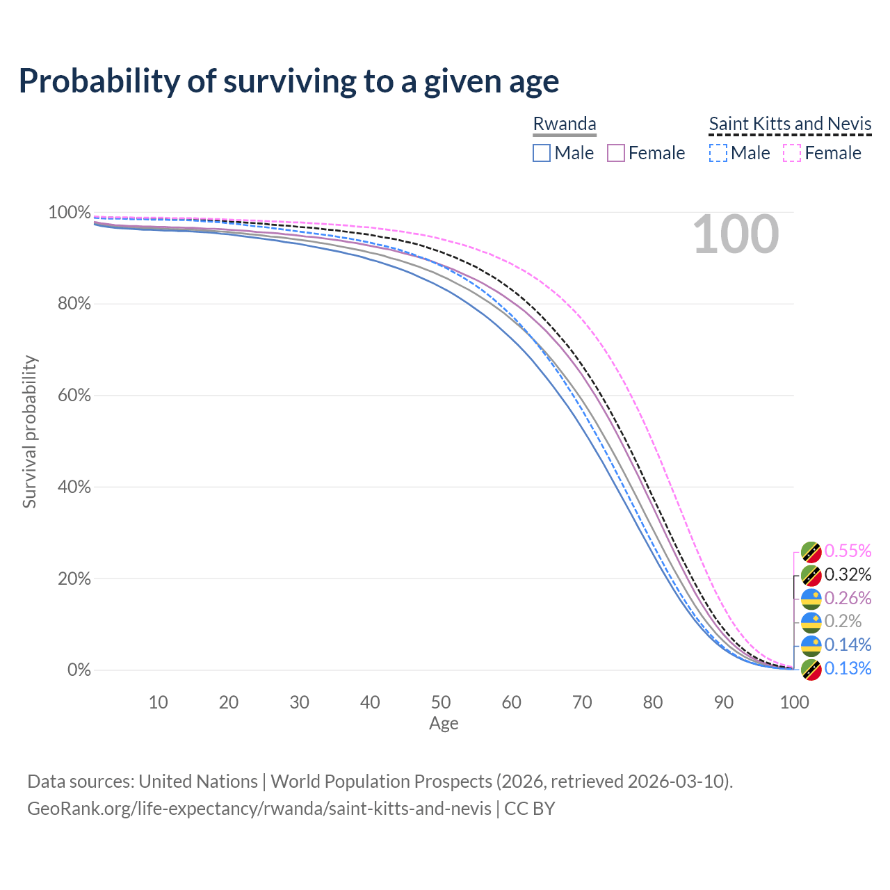 This life expectancy calculator shows the odds of living to 100, 95, 90, and below based on current age for both males and females in Rwanda and Saint Kitts and Nevis, along with mean and median age of death. The calculations are based on the 2026 life tables (actuarial tables) from the UN World Population Prospects.