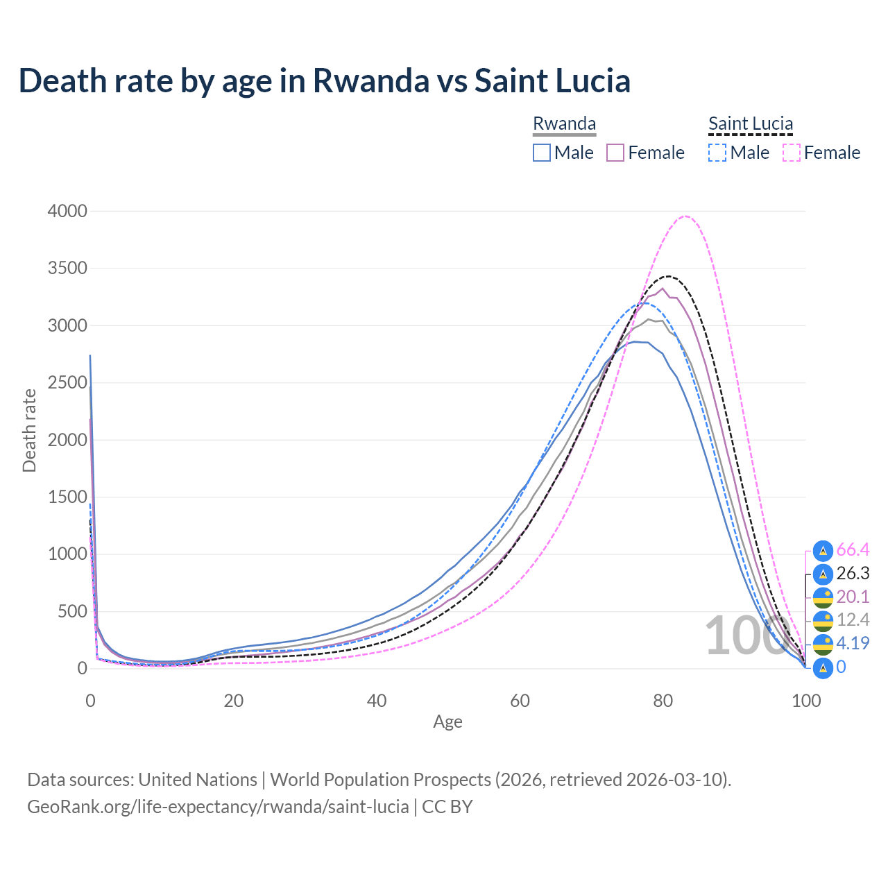 The average life expectancy at birth is 68.5 years in Rwanda vs 73.2 in Saint Lucia. Rwanda is ranked 148/197 by life expectancy, and Saint Lucia is 112/197. In Rwanda, the life expectancy is 66.1 years for males and 70.6 years for females. In Saint Lucia, it's 69.7 years for males and 76.7 years for females.